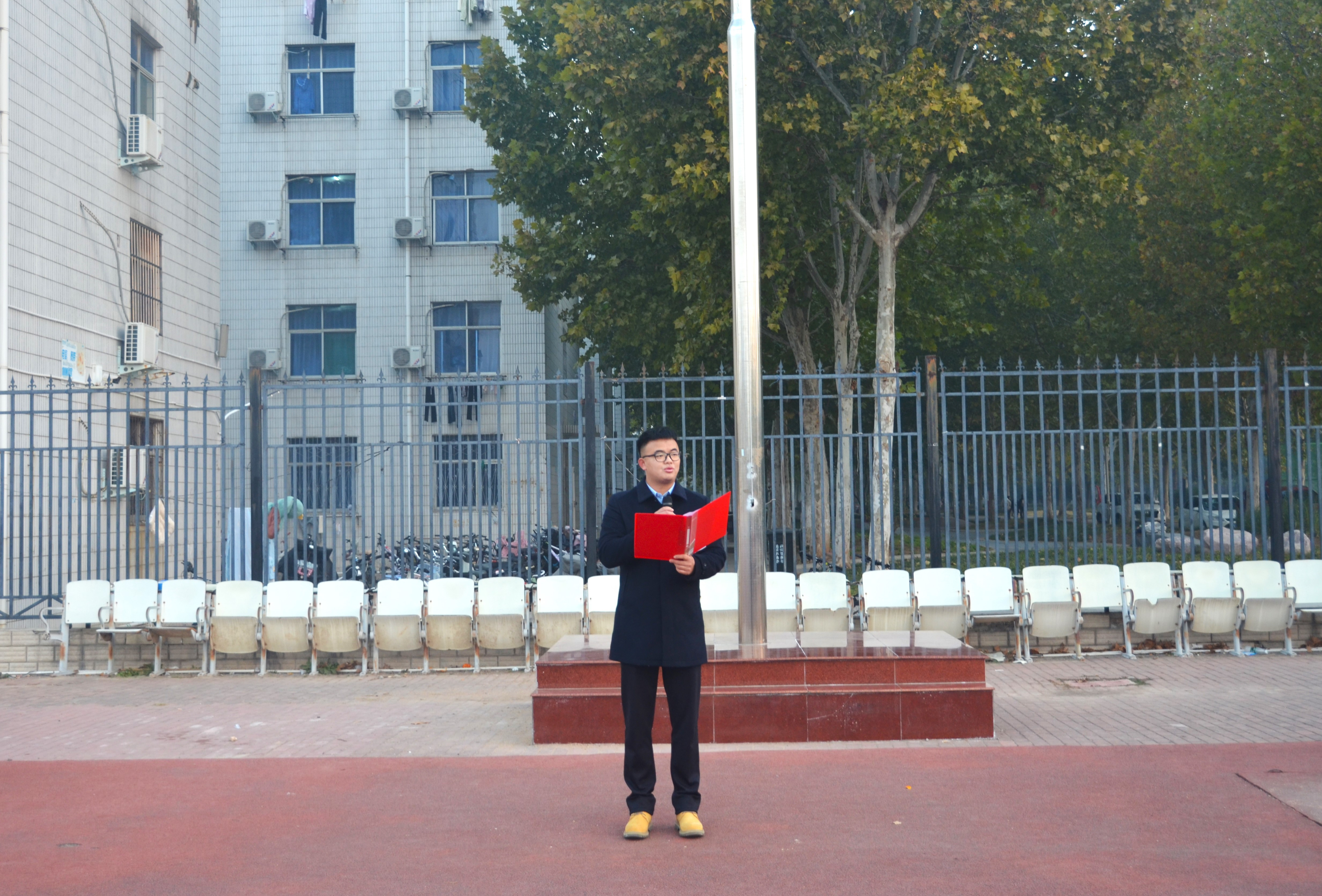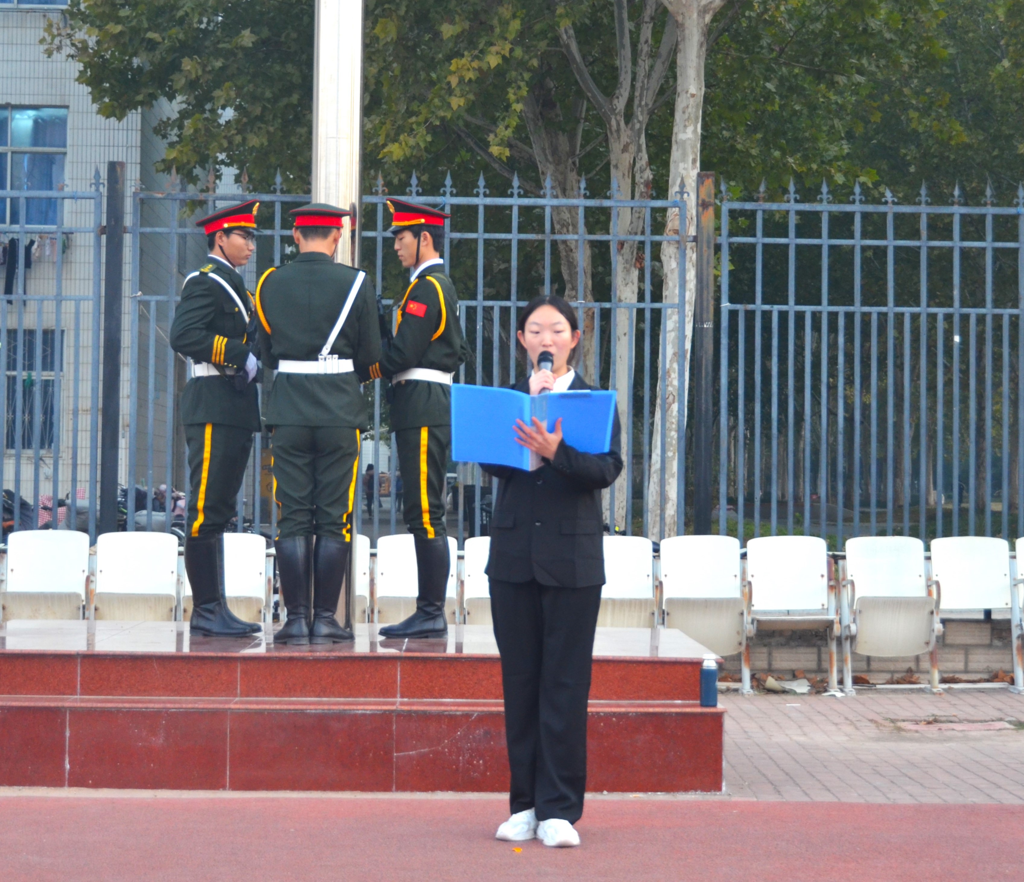 上午6时许,全体参与人员准备就位。7时,升旗仪式正式开始。在全体师生的注目礼下,英姿飒爽的国旗护卫队踏着整齐的步伐护送着鲜艳的国旗走到旗杆下,行礼完毕后,伴随着庄严的《中华人民共和国国歌》,五星红旗冉冉升起,迎风飘扬。在场的每一个人向国旗行注目礼,合唱国歌,表达对五星红旗的崇高敬意和对祖国繁荣昌盛的深切祝福。
