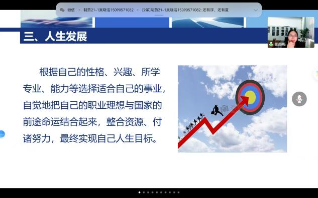 随后张颜梅同志带领大家重点学习了创业精神与人生发展。她指出创业精神包括敢为人先的意志,诚实仁义的品质,持之以恒的意志,团结协作的精神,服务社会的理念,忠诚爱国的情怀。对于人生发展她提出应该自觉地把自己的职业理想与国家的前途命运结合起来,整合资源,付出努力,最终实现人生目标。