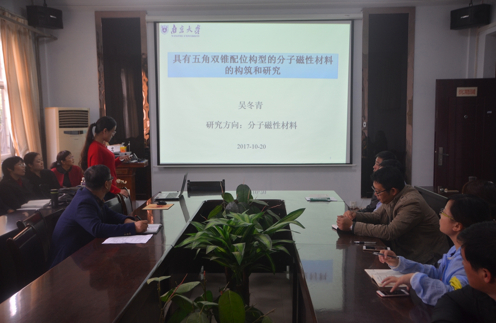2017年10月20日下午,公司教师吴冬青博士在文化路校区7号楼院会议室做了题为《具有五角双锥配位构型的分子磁性材料的构筑和研究》学术报告会。报告会由经理瞿鹏主持,英国365集团官网全体老师参加了报告会。