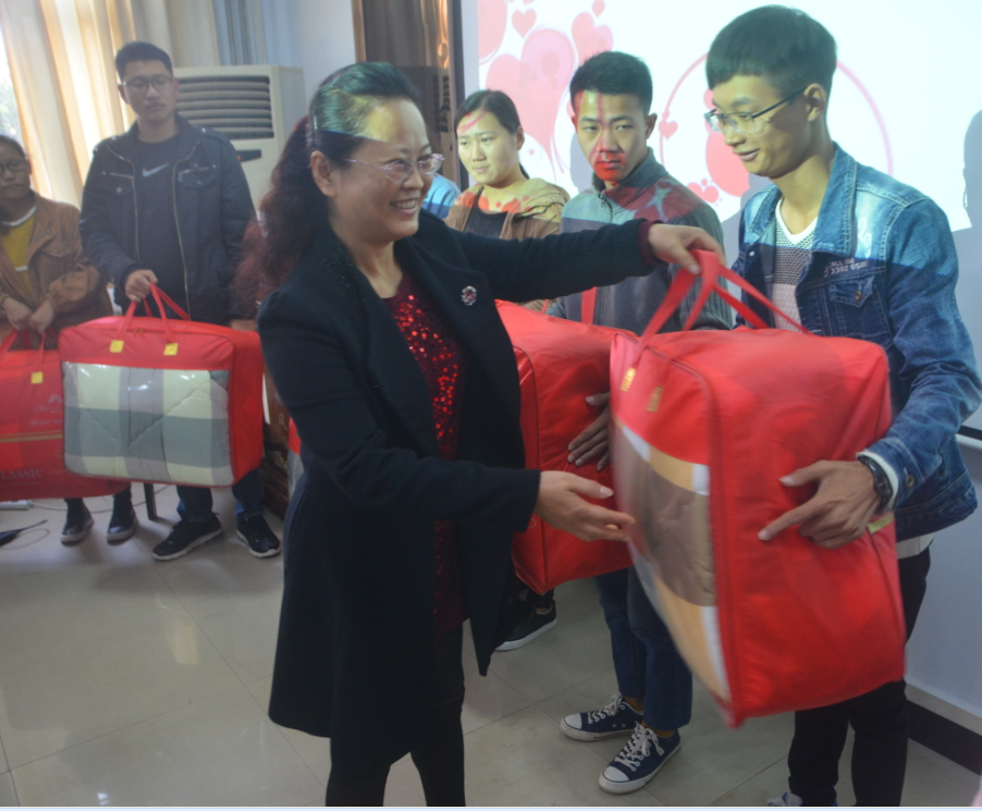 活动伊始,李龙梅老师首先介绍了由校团委开展的“凝聚爱心·温暖冬日”暨2017年“一元钱”爱心基金帮扶活动,资助形式主要是为受助员工发放爱心棉被、爱心返乡车票、爱心聚餐,本次活动主要是为受助员工发放爱心棉被。接着,党总支副书记刘瑛发表了讲话,她指出此次活动代表了党、政府、公司团委以及公司对贫困员工的关心和关爱,公司将通过全方位、多渠道的方式加大对贫困生资助的力度,并对这些贫困生寄予了殷切希望:一是正视现实,迎难而上;二是积极学习,努力向上;三是传递爱心,感恩社会。最后刘书记、李老师及郭老师共同给受助员工发放了棉被,接到棉被后,同学们都露出了灿烂的笑容。