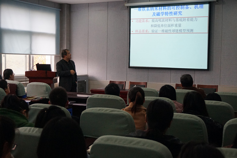 在学术报告中,郭林教授首先介绍了铁系纳米材料的可控制备、机理及磁学特性研究。郭教授课题组合成了一系列表面粗糙度、长度、粗细可控的Fe、Co、Ni纳米链,作为吸波材料,可增强与飞行器表面附着力,并减轻了单位表面积的重量。通过一系列一维纳米材料的研究,郭教授课题组首次验证了Neel-Brown公式并对其进行了修正,取得了理论性的突破。接下来,郭教授又从微、纳有序结构的设计与组装方面给大家介绍了一系列研究成果。通过成果展示,郭教授教导员工在开展科研实验之前要学会利用热力学、动力学理论对纳米材料的调控、组装并预测功能。做到先用理论指导实验,再用实验验证理论。郭教授的学术报告深入浅出,讲解诙谐幽默,不时引发大家的笑声和热烈的掌声。报告会不仅给大家学术上的启迪又让大家感受到做科研的乐趣。