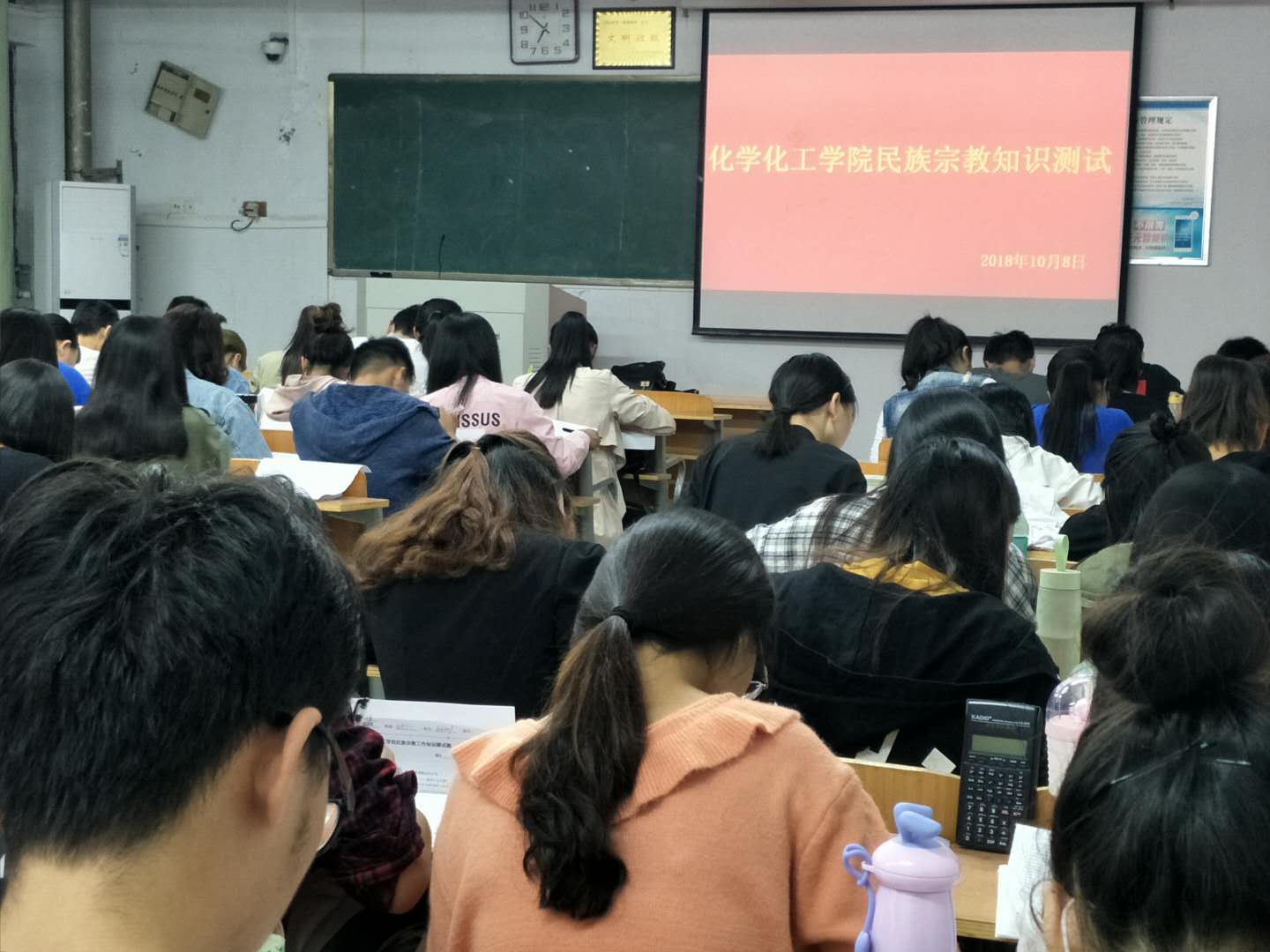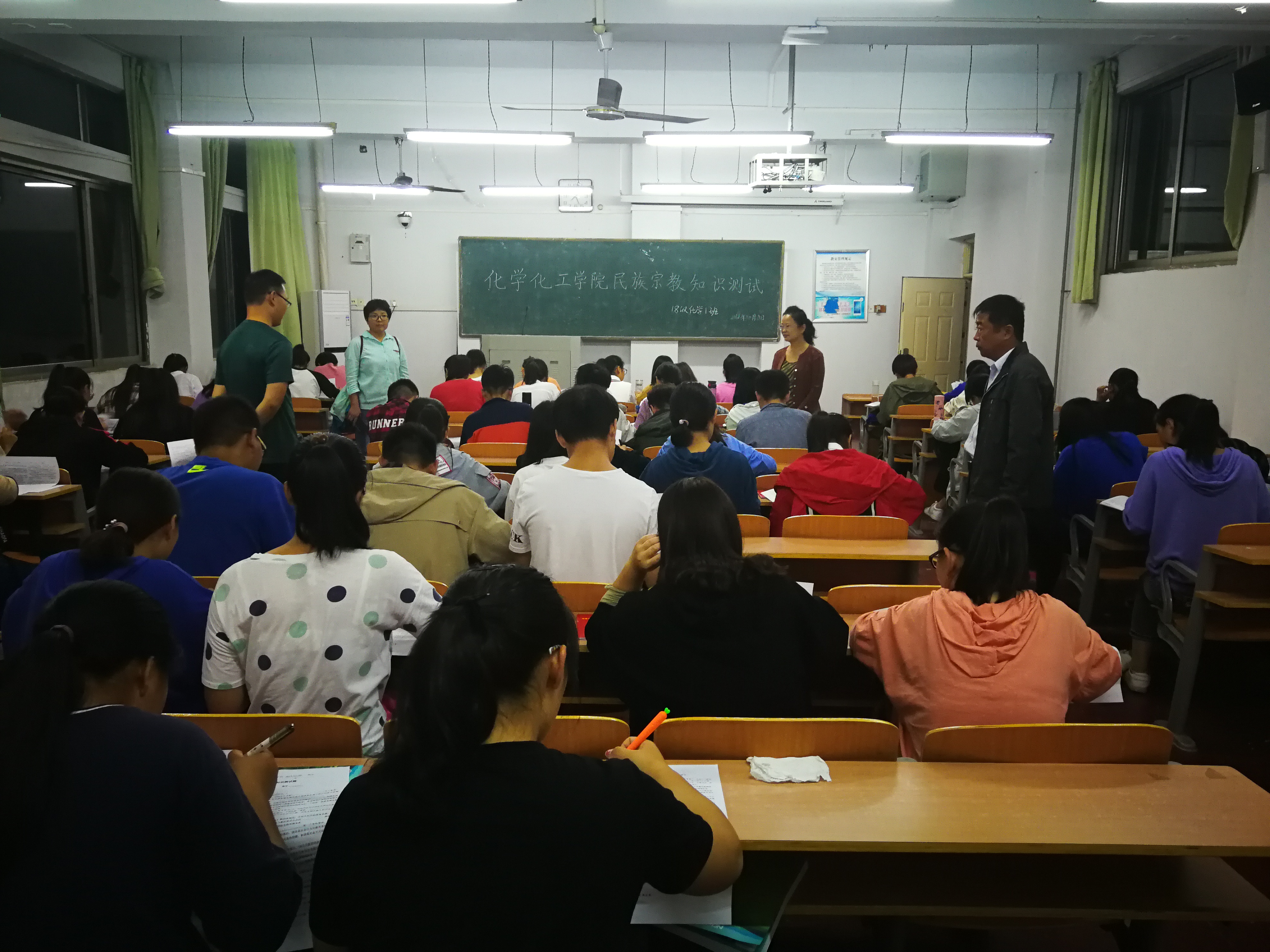 在认真学习《习近平总书记关于民族宗教工作重要论述摘编》和《老员工中国特色社会主义民族宗教理论知识手册》的基础上,10月8日晚,英国365集团官网于文化路校区1号、6号教学楼部分自习室进行《习近平总书记关于民族宗教工作重要论述摘编》和《老员工中国特色社会主义民族宗教理论知识手册》等民族宗教工作知识测试竞赛活动。公司16、17、18级全体员工近800名参加了活动,由各班班主任老师监考,党总支书记韩忠民、副书记刘瑛及各年级辅导员巡视。