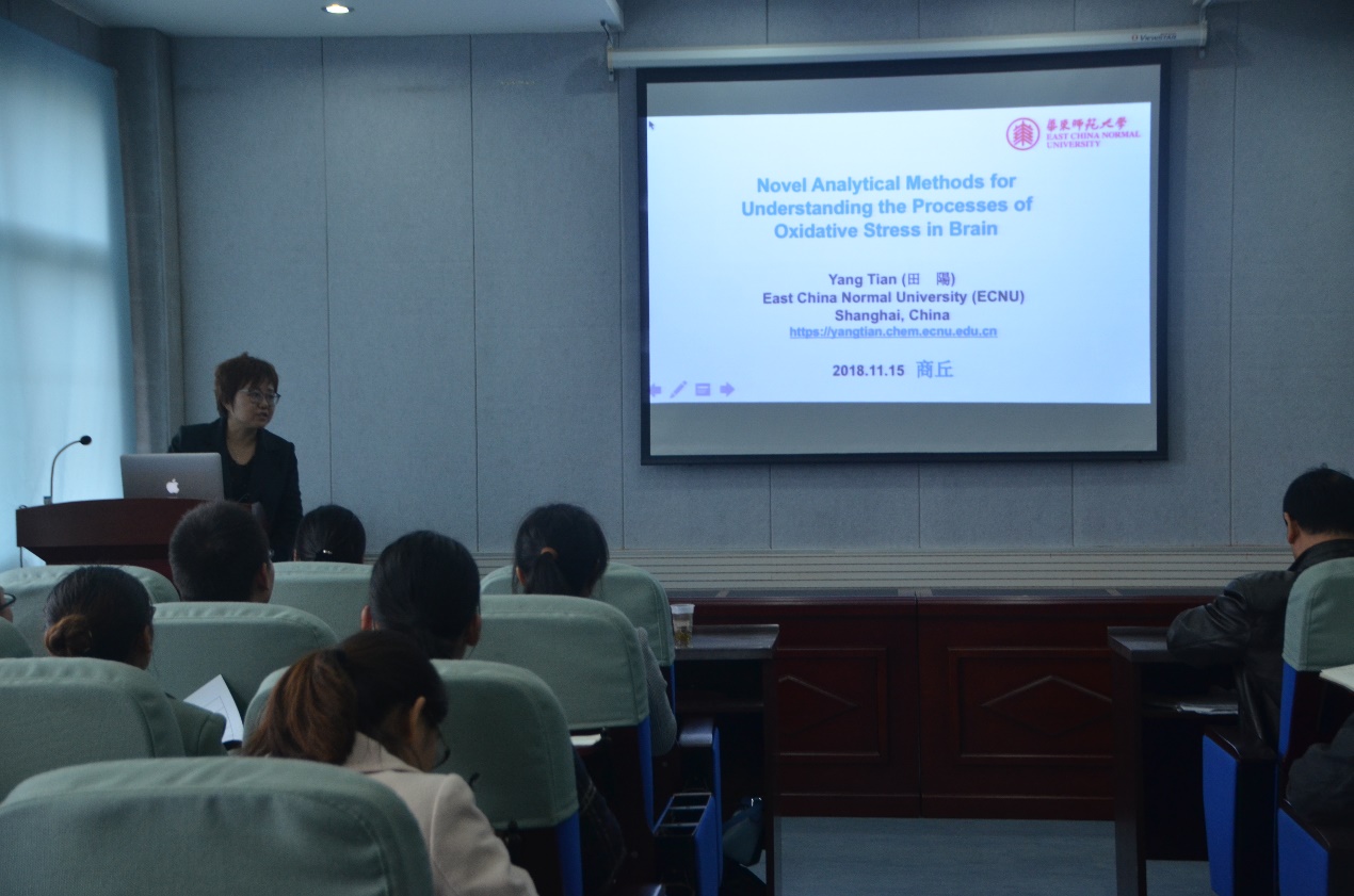 田阳教授报告会的题目为“氧化应激分析化学研究的新进展”,田教授首先介绍了活性氧及氧化应激的类别、产生过程、生理病理的相关性。随后田教授介绍了自己课题组近几年来在氧化应激相关分子离子检测与成像领域的重要研究进展。通过设计引入特异性的识别配体及内参比电信号基团,田教授团队开发了系列用于脑部铜离子、pH及O2原位检测的高特异性比率式电化学分析新方法。此利用特殊结构的核酸载体,田教授课题组还构建了一种线粒体靶向且可同时检测钙离子与pH的多功能DNA纳米探针体系。戴志晖教授报告会的题目为“基于表界面调控的高灵敏传感策略”,戴教授首先介绍了通过表界面调控来构建高灵敏电化学传感体系的整体研究思路。随后戴教授从1.利用金属的电荷调控作用,促进界面电子转移,提高生物传感性能;2.发现材料表界面电荷对电致化学发光效率的影响;3.提出表界面靶诱导聚集的信号积累新方式三个方面讲述了最新研究工作。戴教授课题组从电极材料的设计制备、微观结构性质的表征等方面对所构建的新型电化学传感体系进行了深入系统的阐释。通过精彩的学术报告,两位教授展示了各自独到的科研视角,也让各参会师生深受启迪。