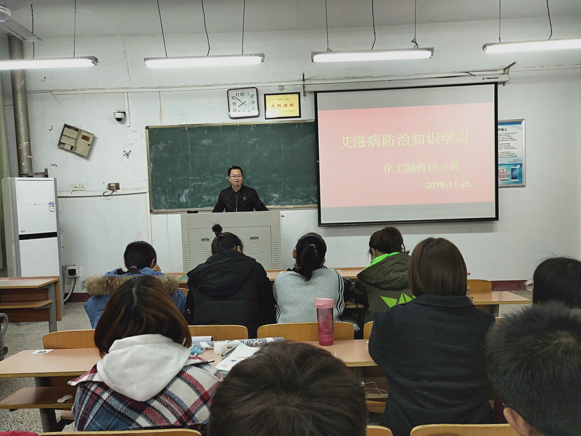 2018年11月25日晚,化工制药18-1班在文化路校区一号楼408教室举行了“艾滋病预防知识宣传与学习”主题班会。班主任王涛老师主持此次班会,化工制药18-1班全班员工参加了本次主题班会。