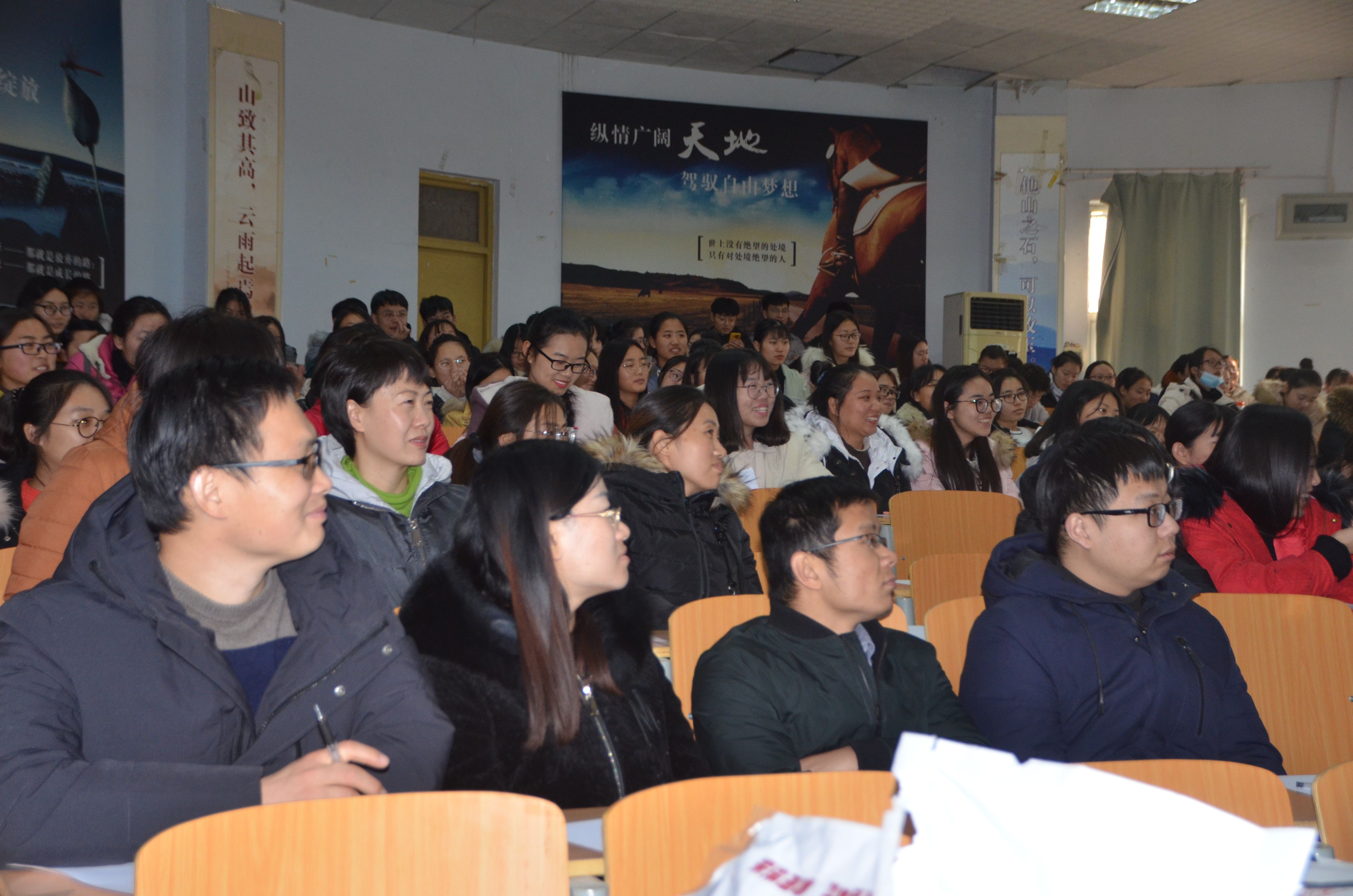 主题讲座的开展形式为互动式、体验式学习。在隋春阳的激情讲解的同时也从发现自己、了解自己、突破自我、遇见未来的自己及梦想启航等五个方面开展了“认识朋友”、“一分钟拍手”、“压手臂”、“我的优势树”等多个互动体验,同学们通过这些互动重新认识了自己,更加相信了自己。“死亡爬行”的视频更是深深触动了在座的所有人内心最柔软的地方,也更加坚定了同学们努力学习,追逐梦想的信心。“不逼自己一把就不知道自己有多优秀”简单的语言但却铿锵有力、掷地有声,也正是这句话给了在座的同学们勇往直前的力量。