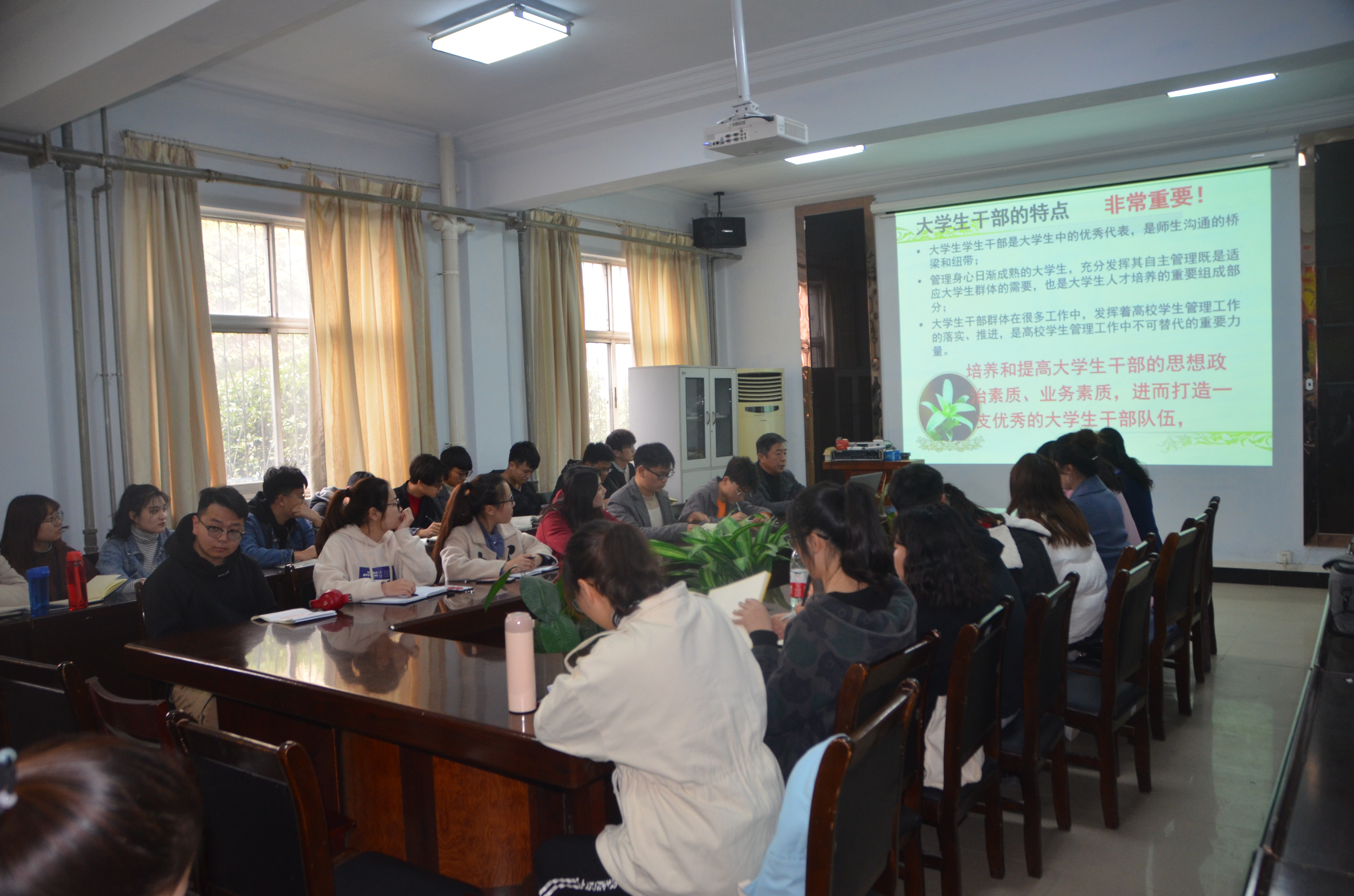会议伊始,韩忠民从员工干部应具备的基本礼仪、基本素质、基本意识、基本能力和员工干部应处理好的若干关系五大方面详细概述如何培养和提高团学干部的综合素质。身为一名员工干部要德才兼备、先人后己、襟坏坦白、严于律己、自我反省;要树立社会意识、责任意识、团队意识、创新意识、形象意识;要有良好的交际能力、表达能力、组织管理能力、创新决策能力、随机应变能力;要提高道德、心理、身体素质,要学会处理好与领导老师、同学以及干部之间的关系。随后刘瑛对员工干部提出了提高政治站位,增强政治敏锐性;服务师生;真抓实干,注重成效三个方面的具体要求,并以村官李天成豫剧《吃亏歌》告诫员工干部们要学会吃亏,多奉献。最后,李龙梅总结,希望大家认真领会培训精神,努力做到个人像鹰一样,团队像雁一样!