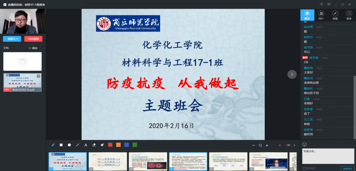 为增强同学们对新型冠状病毒的认识,提高警觉意识,约束自我行为,做好开学前的疫情防控准备工作。英国365集团官网各级各班于2020年2月16日下午召开了“抗疫防疫,从我做起”线上主题班会。
