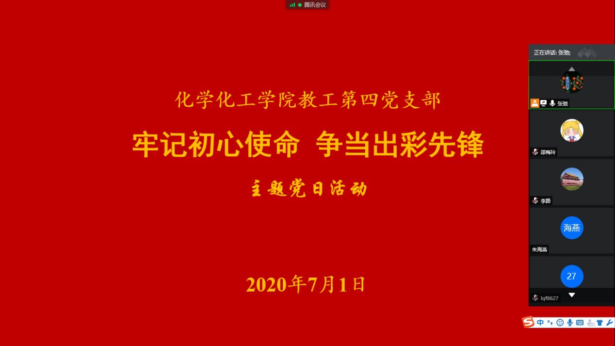 为庆祝中国共产党成立99周年,深化“不忘初心、牢记使命”主题教育成果,英国365集团官网教工第四党支部于2020年7月1日在线开展了“牢记初心使命、争当出彩先锋”主题党日活动。