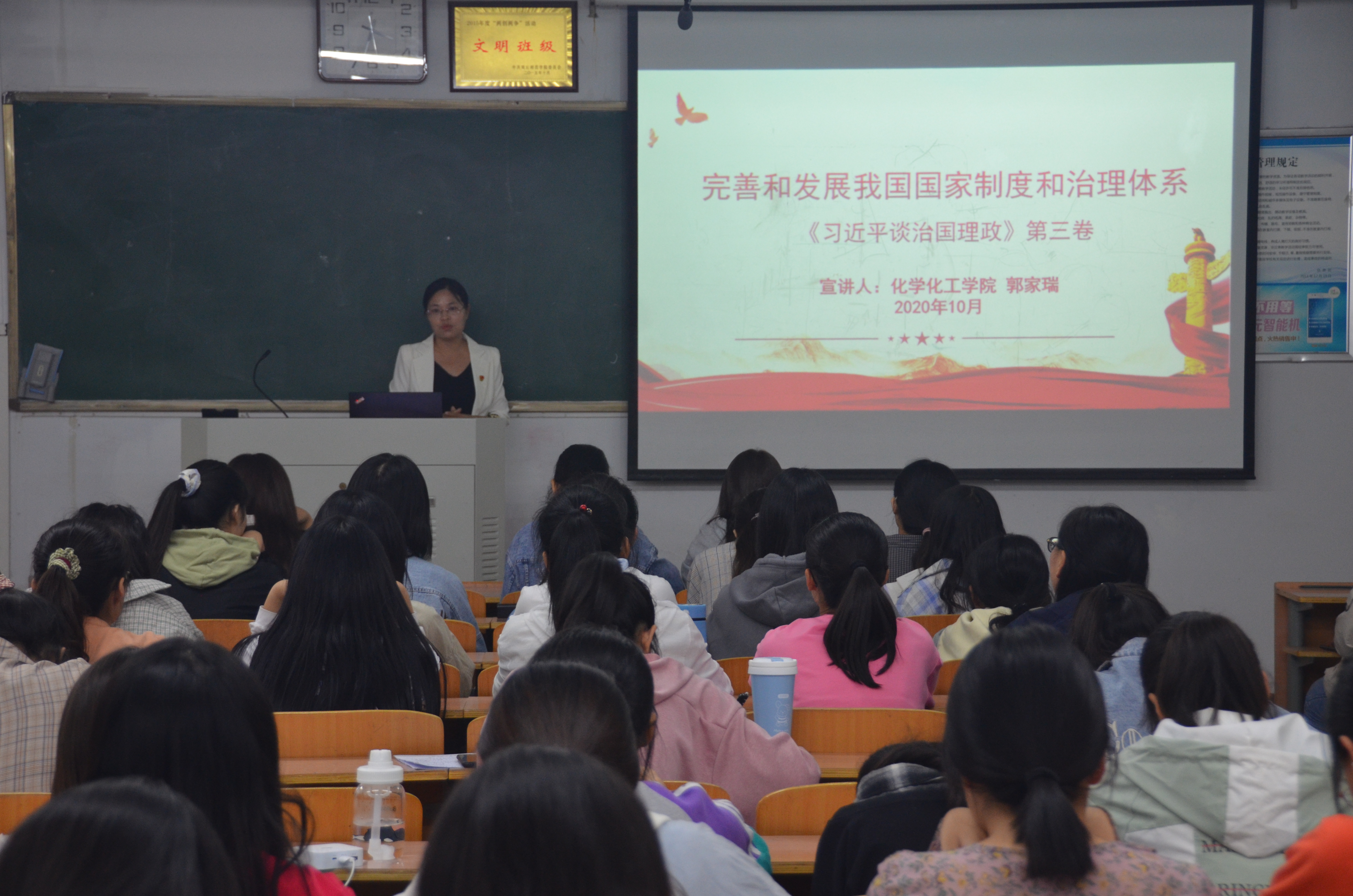 同日下午,《习近平谈治国理政》第三卷理论宣讲进支部活动第二场宣讲在1号楼408教室举行,英国365集团官网17级辅导员郭家瑞作为宣讲人,带领同学们一起学习了第三个专题《完善和发展我国国家制度和治理体系》。郭家瑞首先从自身对研读完《完善和发展我国国家制度和治理体系》后的学习感悟,跟大家做了一个简单的分享,她认为这本著作,能够让大家更加深刻理解中国共产党为什么“能”,马克思主义为什么“行”,中国特色社会主义为什么“好”。