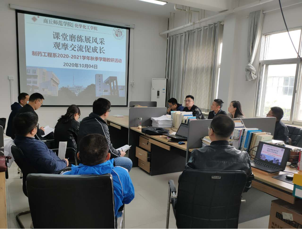 为进一步提高新入职青年教师的专业素养和教学能力,夯实青年教师驾驭课堂的基本功,落实公司公司青年教师培养计划,2020年10月04日制药工程系在化学实验楼416室召开了以“课堂磨练展风采,观摩交流促成长”为主题的教研活动。教研活动由系主任王涛老师主持,制药工程系全体老师参加此次活动。