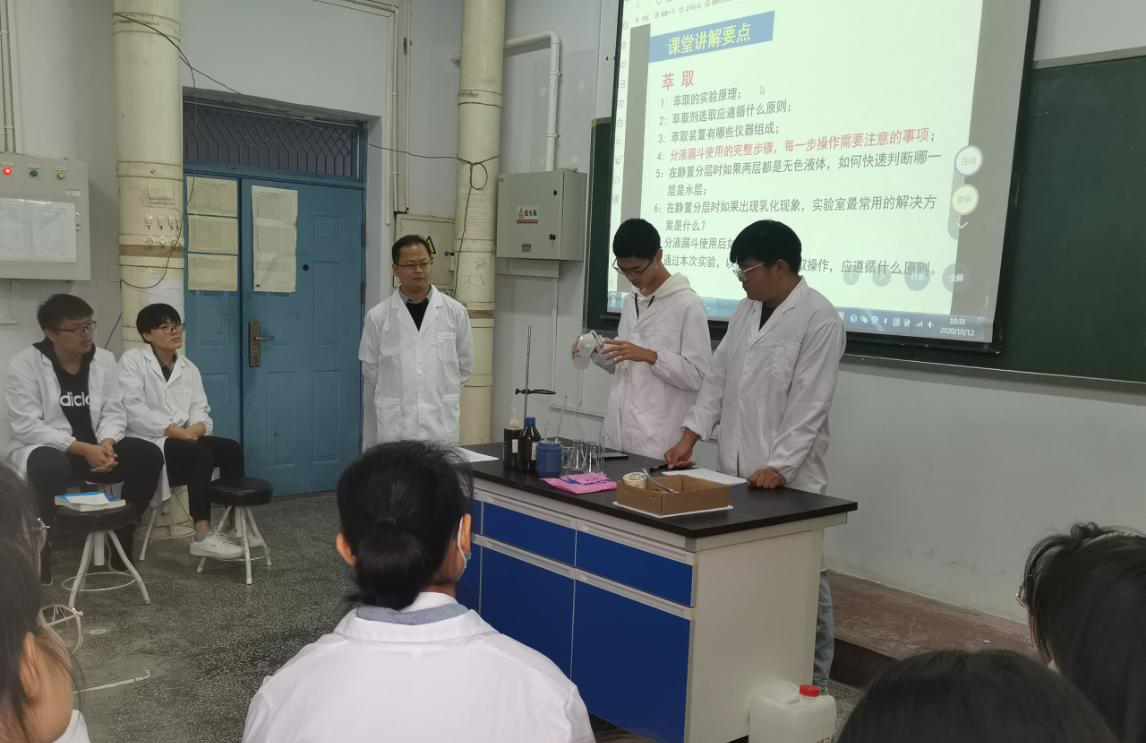公开课前,王涛老师首先向各位观摩教师介绍了《有机化学实验》课程范式改革的目标、改革的举措以及目前同学们对课程模式的反馈情况。此次公开课的内容是有机化合物分离提纯中的“萃取操作”,教学方法采用“课前:布置任务点+员工线上预习;课中:翻转课堂(小组合作)+教师总结;课后:实验报告+问题跟帖讨论”线上线下相结合的模式展开。首先,王老师通过回顾有机化合物分离提纯操作--常压蒸馏、简单分馏的操作要领,引导员工对有机化合物分离提纯又一操作萃取实验进行实验目的及要点梳理。接着,为了更好的调动员工的学习积极性,通过随机抽签的方式进行翻转课堂的小组合作汇报,加深同学们对分液漏斗操作要领的掌握,并且在小组汇报结束后,其他小组及同学针对该小组汇报的内容进行讨论、评价和提问。最后,王老师针对同学们的翻转课堂进行查漏补缺。整个课程内容充实设计巧妙,充分调动了员工的主观能动性,课堂气氛十分活跃,员工对萃取操作的要点也有了更好的理解。