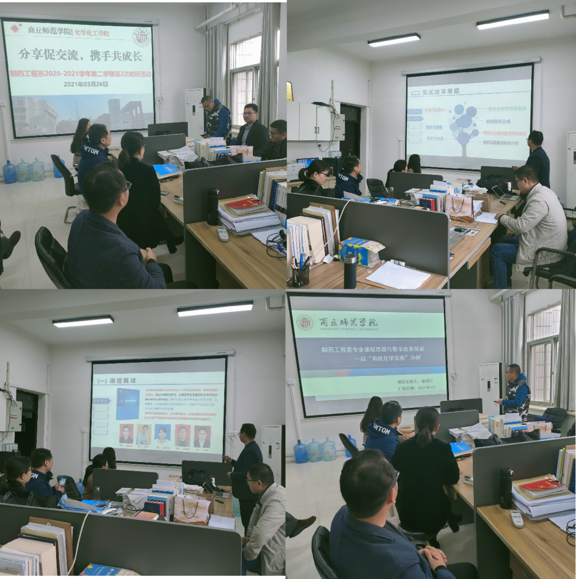 为了推动教学改革和教师发展,增加专业课教师之间的切磋、交流和学习,秉承着互相学习、促进发展的原则,2021年03月26日,制药工程系在化学实验楼416室召开了以“分享促交流,携手共成长”为主题的教研活动。教研活动由系主任王涛老师主持,制药工程系全体老师参加此次活动。