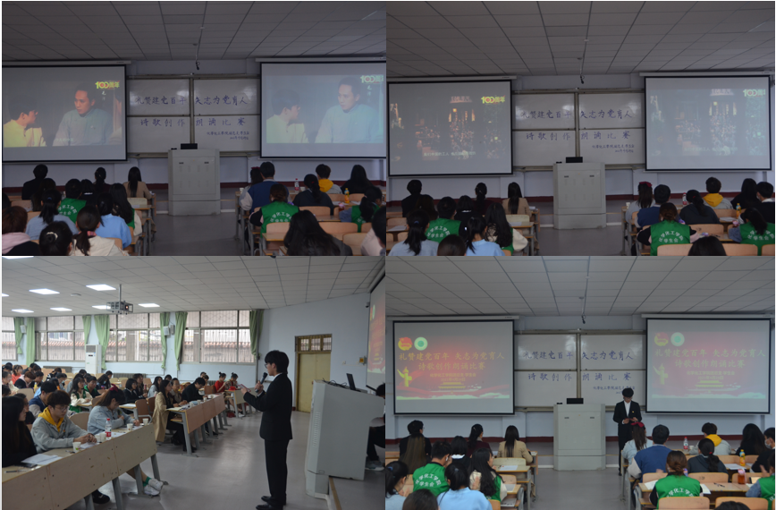 在主持人介绍完评分细则后,诗歌创作朗诵比赛正式开始。参赛者围绕建党爱国进行诗歌创作,通过朗诵诗歌来歌颂伟大时代、伟大人民、伟大政党。选手们声情并茂、充满活力的朗诵感染着在座的每一位同学,把在座的观众带进了异彩纷呈的诗歌世界。“祖国与党”这动人的字眼一再出现,激动的心情难以言表,都化作了诗歌。透过他们的朗诵,观众们仿佛看到了这100年来共产党历经的风风雨雨以及取得的种种成就,重温了中国共产党的百年征程。