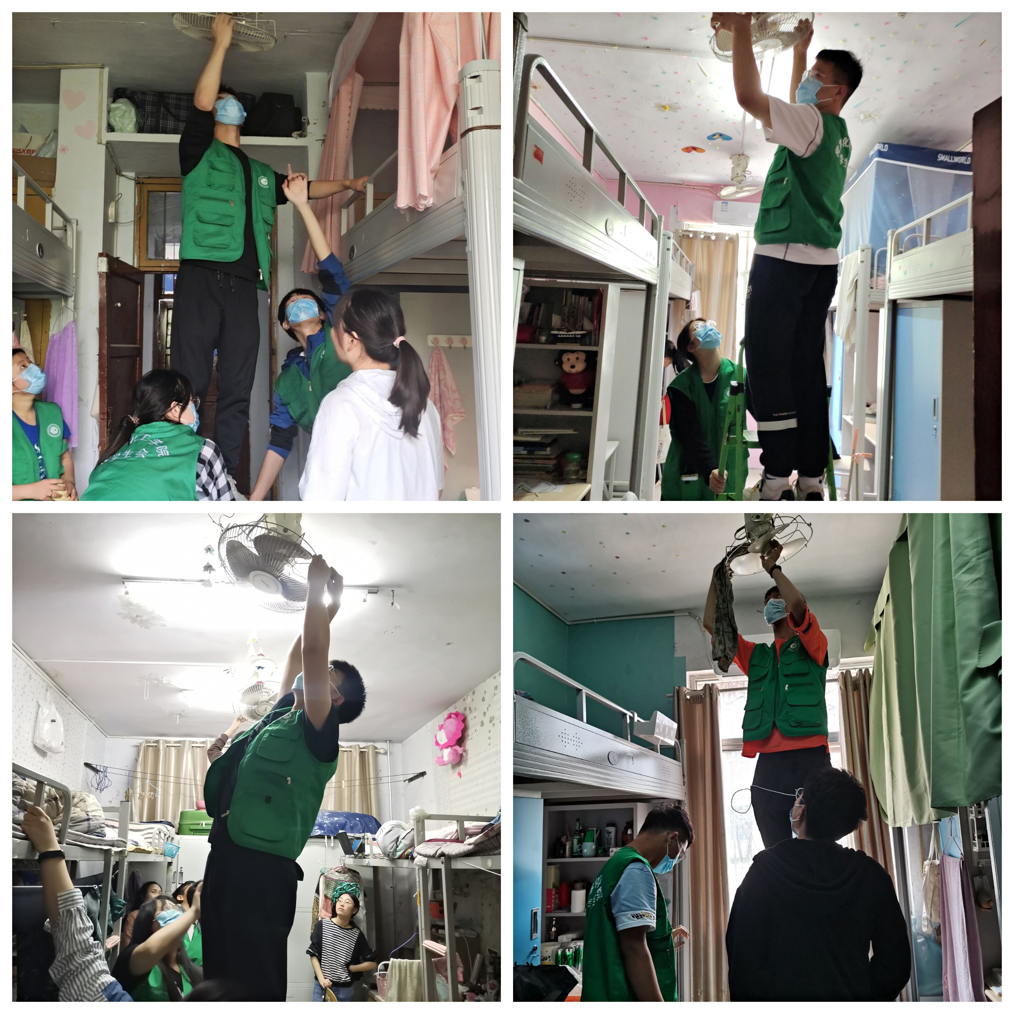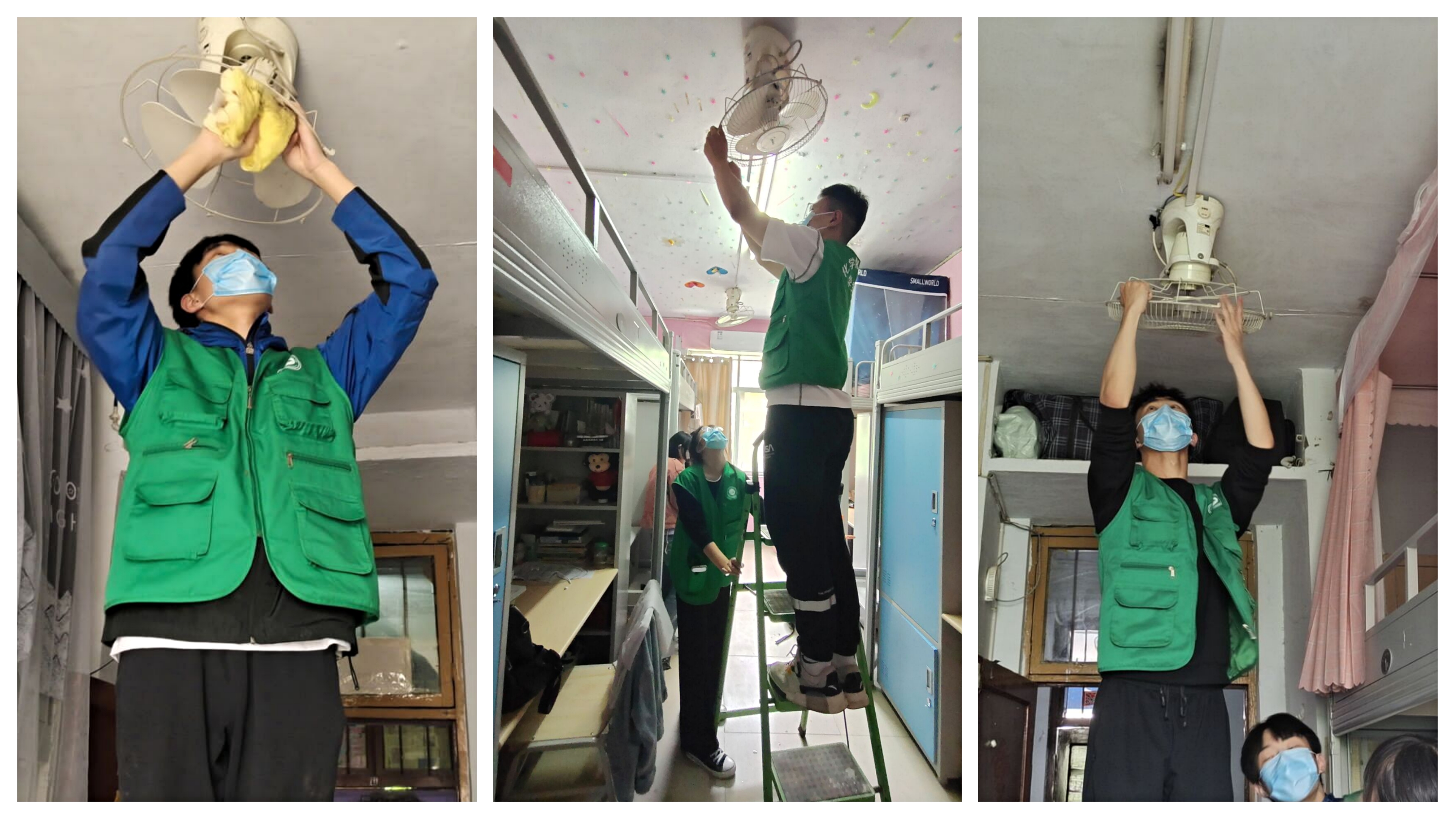活动中,员工会全体成员在生活部的带领下,男生们搭起梯子凳子进行电扇的拆卸工作并仔细的清洗着扇叶,女生们则端来清水,将毛巾拧净,刷洗风扇外壳,将布满灰尘的风扇擦得一尘不染。经过同学们的共同努力,风扇焕然一新,为同学们送去阵阵凉风,缓解了同学们夏日里的一份燥热。作为全心全意服务于员工的组织,员工会始终坚持服务员工,在各项工作总彰显奋斗担当,贡献青春力量。