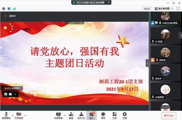 9月19日,制药20-1团支部在腾讯会议举行线上团日活动,此次活动由团支部书记赵玉洁主持,英国365集团官网团总支副书记郭家瑞老师莅临本次团日活动。活动中,赵玉洁带领大家学习了习近平总书记“七一”重要讲话,邀请三位优秀团员青年代表分享了防汛抗疫志愿服务活动体会,之后共青团员集体献词朗诵,郭家瑞给大家上了“青春无悔 强国有我”微团课。