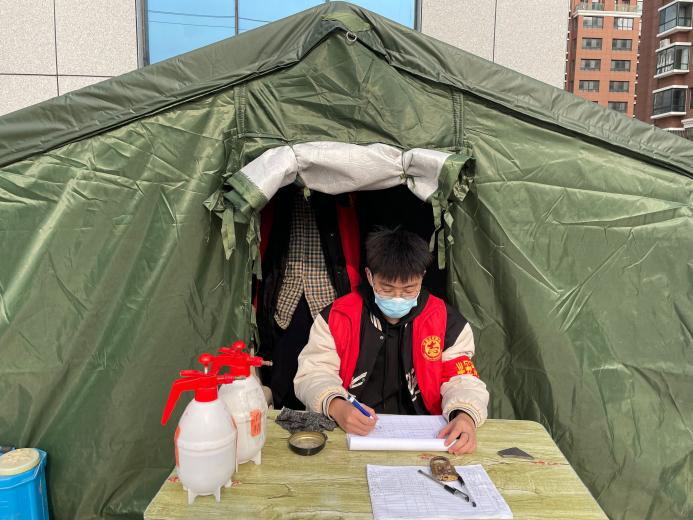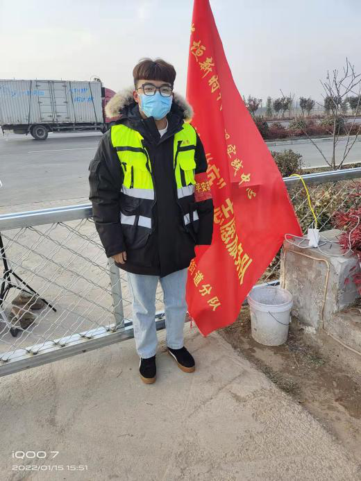 1月15日,活动第一天,疫情形势严峻,全国各地皆展开疫情防控工作。虎虎生威队成员王赞豪为践行“强国有我,请党放心”的青春誓言,积极参与家乡疫情防控工作。不惧寒冷,在疫情防控卡点值班、查看健康码、记录来往人员车辆信息、测温、消毒等工作。对于不方便的人群如老人和儿童,进行特殊服务,在安全的前提下,保障他们可以顺利出行。