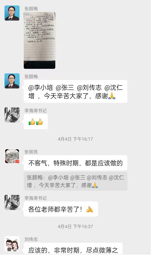 研究生复试必须要体检了,党委副书记张颜梅亲自带领李小培、张明亮、刘传志、户志远、沈仁增等老师组成车队护送员工至医院,并安全接回;员工的脚崴了,甲沟炎犯了,李小培老师来了;晚上八点员工忽然发烧,刘新明老师第一时间把员工送到北关医院,全程陪同,直到晚上十点员工看完病,再把员工送回到公司门口……