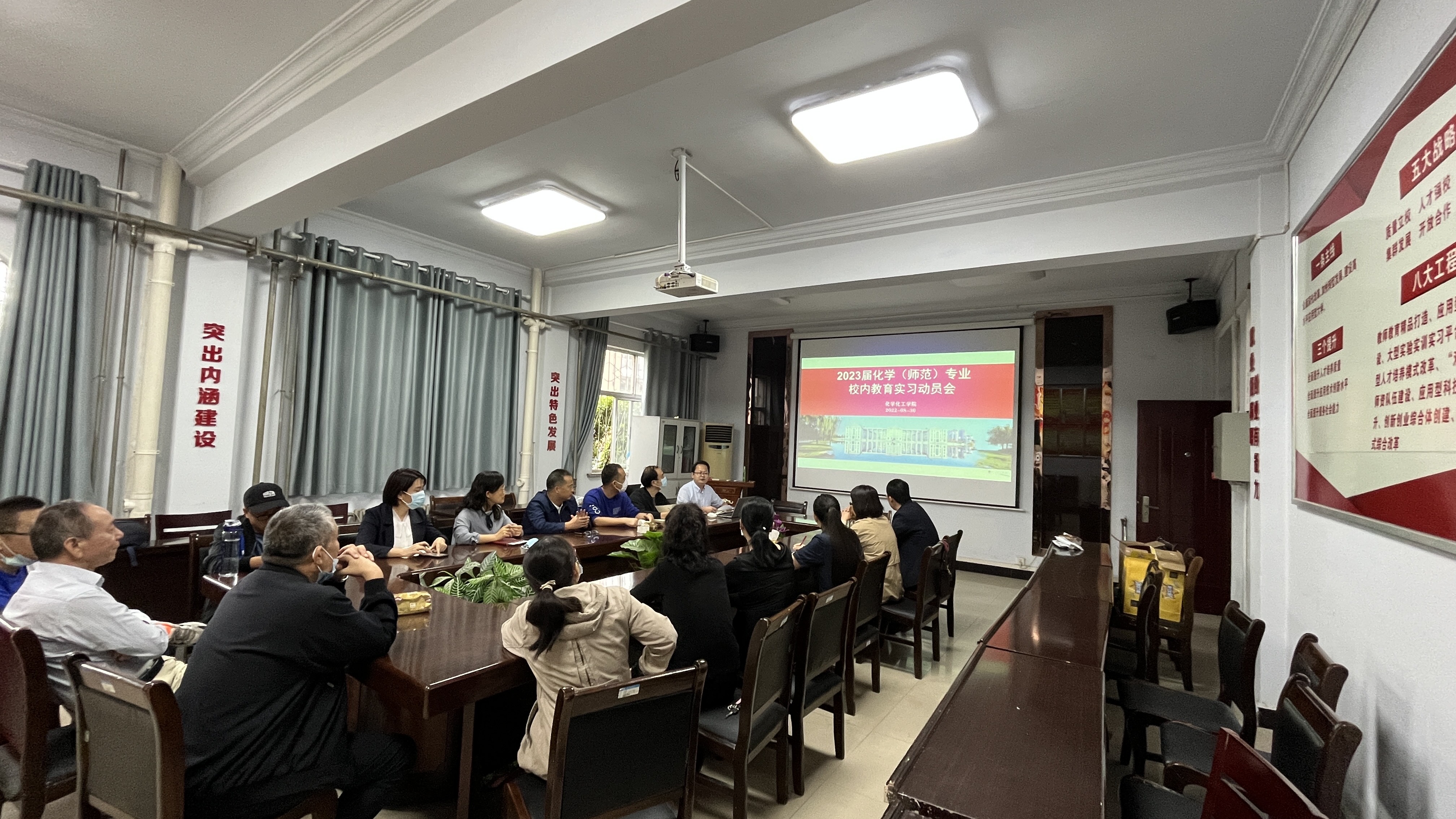 为更好地开展化学(师范)专业教育实习工作、提升化学师范生公司产品技能,公司于8月30日下午采用线上线下相结合的方式组织召开2023届化学(师范)专业校内教育实习动员会,经理张银堂、副经理王涛、化学系主任韦秀华、校内实习指导老师以及2019级化学(师范)专业全体本科生参加本次会议。会议由副经理王涛主持。