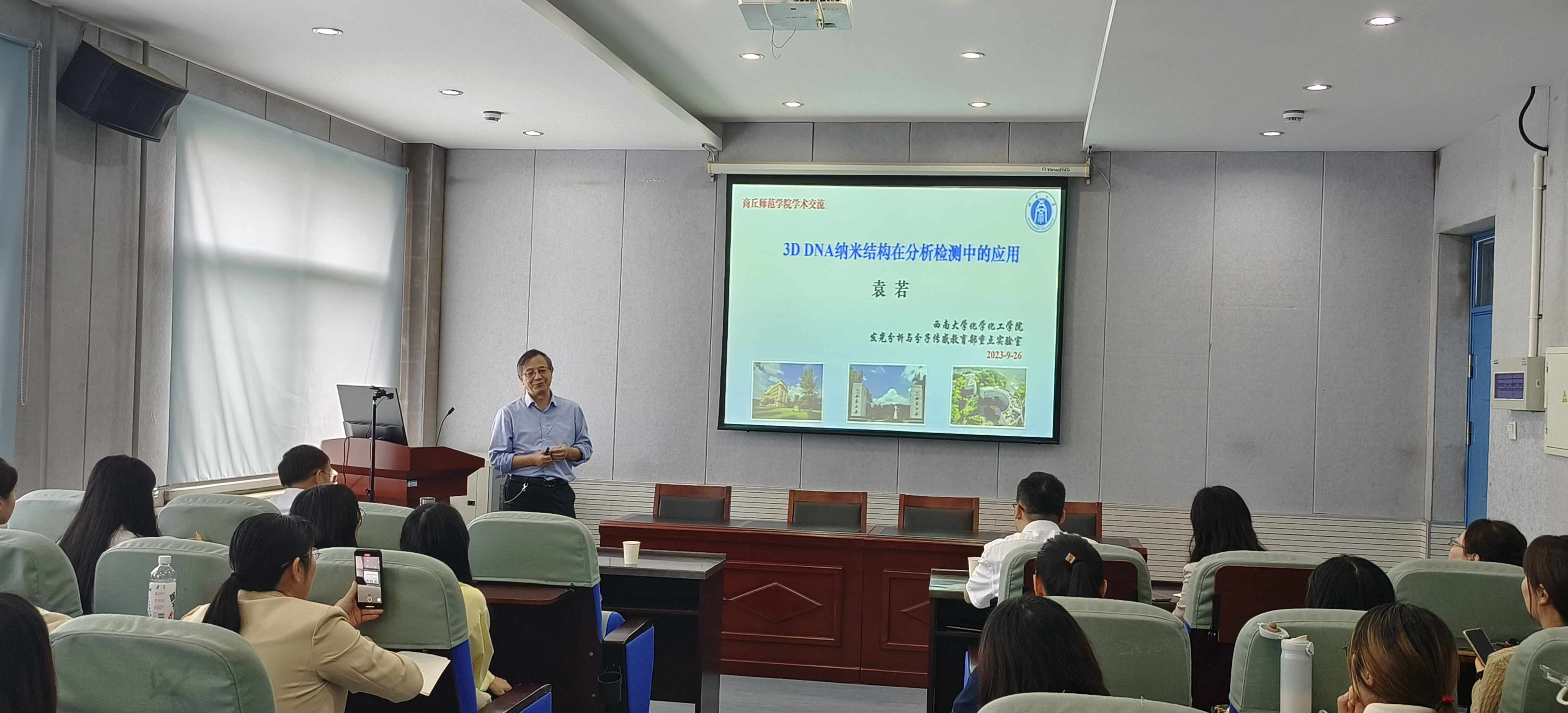 9月26日,应英国365集团官网邀请,西南大学袁若教授在公司睢阳校区化学实验楼311报告厅作了题为《3D DNA纳米结构在分析检测中的应用》的学术报告。报告会由英国365集团官网经理张银堂主持,河南省生物分子识别与传感重点实验室主任徐茂田教授、公司部分教师、研究生及本科生参加。