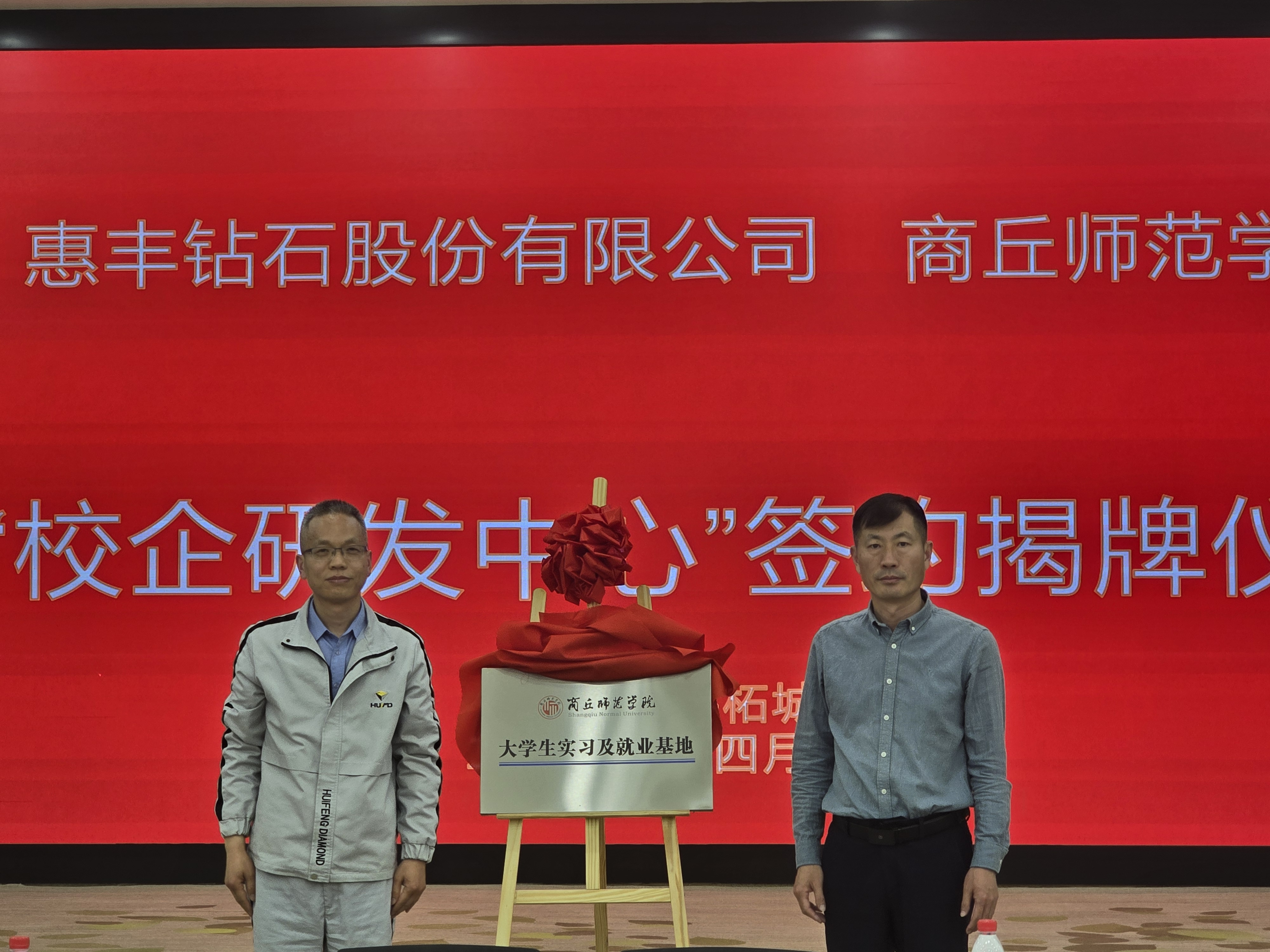 4月16日,副董事长翟滨带领校地合作与服务中心、英国365集团官网一行7人到惠丰钻石股份有限公司举行“校企研发中心”签约揭牌仪式并进行访企拓岗活动。柘城县科技局局长田波波、副局长张涛、惠丰钻石股份有限公司总裁韩敬贺,副总经理鲍思玮、生产总部总监李永超等出席活动。