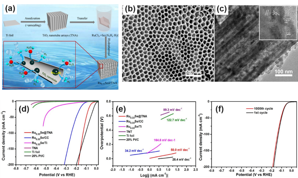 目前,析氢反应(HER)最高效的催化剂为贵金属铂,但高昂的价格及相对短缺的资源储量极大地限制了其在工业领域的广泛应用。非贵金属化合物被广泛用于电催化析氢反应且表现出优异的电催化活性,但是这些非贵金属类电催化剂的性能仍然低于贵金属类催化剂。虽然钌也是贵金属的一种,但其价格仅为铂的1/25,并且金属钌还可以高效地促进水的解离过程,因此极少的钌用量有助于获得高活性的电催化剂。作者以TiO2纳米管阵列(TNA)为载体,通过简单的水热反应沉积Ru0.33Se纳米粒子,得到Ru0.33Se@TNA复合体系,TiO2纳米管具有较大的比表面积和特定的电荷传输通道,Ru0.33Se纳米粒子负载于TiO2纳米管阵列上可以抑制纳米粒子间的团聚从而暴露更多的活性位点,降低电荷传输阻力,提高材料的电催化活性,Ru0.33Se@TNA作为析氢电极,在碱性介质中表现出优异的电催化活性,电流密度达到10 mA cm-2所需的过电势仅为57 mV,这一过电势明显小于文献中报道的过渡金属化合物析氢电催化剂。同时该复合电催化剂还具有良好的稳定性,在电流密度为10 mA cm-2的条件下进行连续电催化析氢反应,能够稳定运行10h以上。作者的研究表明,在保证高析氢活性的前提下,降低贵金属用量,可作为设计廉价高效电催化剂的一种策略,从而为新型高效电催化材料的开发研制提供了新的思路。