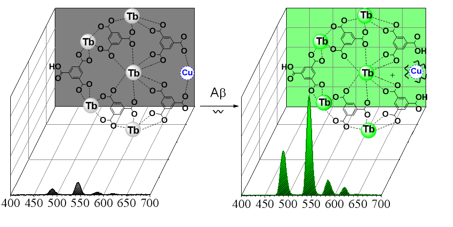 阿尔茨海默(Alzheimer's disease,AD)俗称老年痴呆,目前很难治愈。然而,通过对其标志物进行早期诊断、提前预防并对症治疗,可以有效减缓甚至阻碍疾病的进一步恶化,提高患者的生活质量。本课题组首次将Cu2+作为荧光猝灭剂引入到稀土金属有机配位聚合物中,作为AD标志物Aβ1~40的识别单元,并利用稀土的时间分辨荧光的长寿命特征,进一步对血浆中Aβ1~40进行了直接测定。相比于传统的研究方法,该方法采用血浆做标本,消除了患者对脑脊液采集的恐惧心理;此外,利用稀土纳米配合物时间分辨荧光测定Aβ1~40,可以有效消除复杂体系中生物样品的干扰,从而提高大大提高检测的灵敏度与选择性。