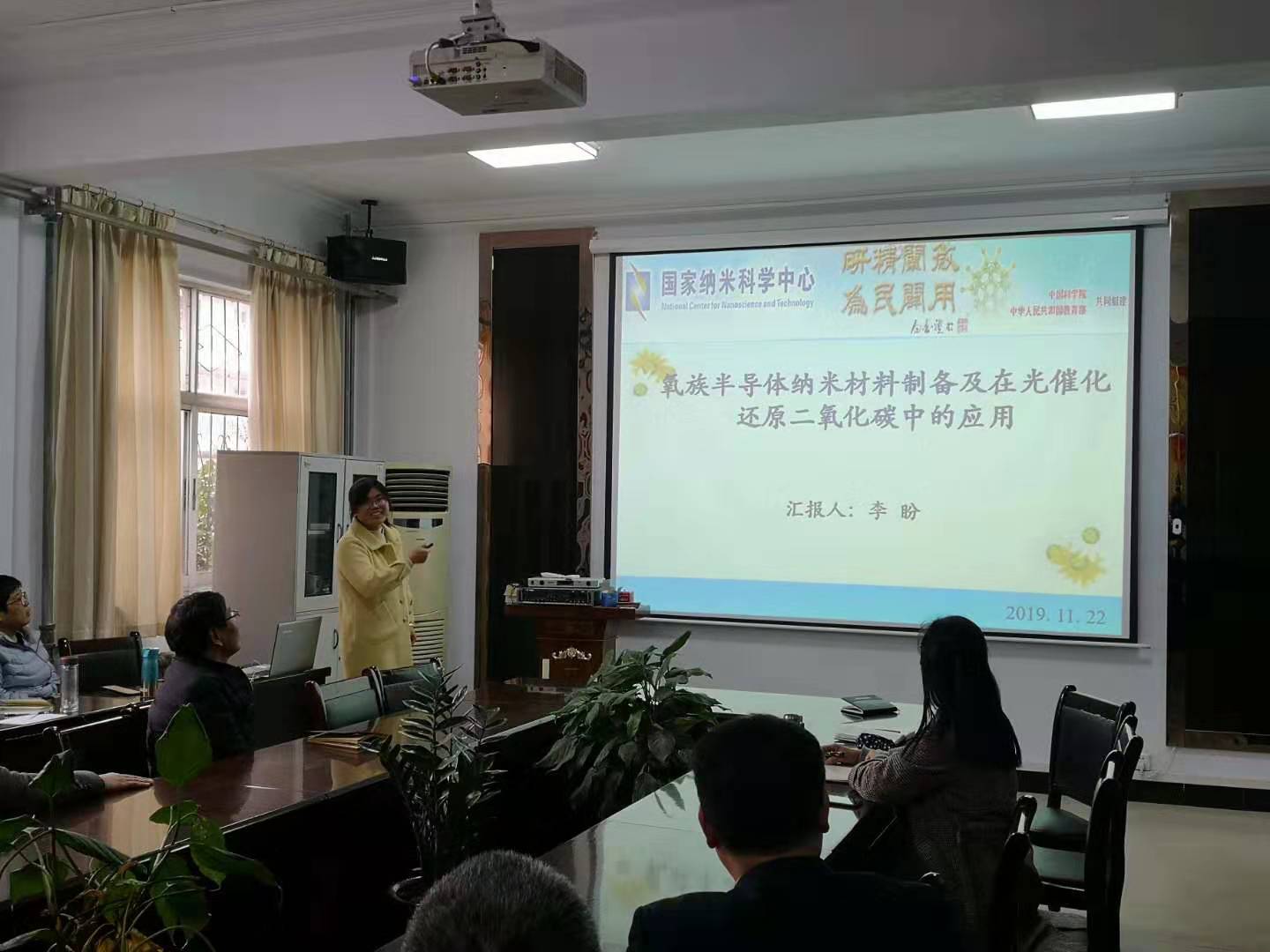 2019年11月22日下午,英国365集团官网教师李盼博士在文化路校区7号楼院会议室做了题为《氧族半导体纳米材料制备及在光催化还原二氧化碳中的应用》的学术报告会。报告会由周艳丽副经理主持,英国365集团官网全体老师参加了报告会。李盼博士向大家汇报了攻读博士学位期间在氧族半导体纳米材料制备及光催化还原二氧化碳应用领域所做的工作。首先介绍了光催化还原二氧化碳的研究背景及其机理;然后着重介绍了其博士期间所做的研究工作,包括:多孔ZnO纳米片中缺陷对光催化还原CO2的影响研究;ZnS纳米片中缺陷对光催化还原CO2的影响研究;ZnS@ZnO核壳结构的构筑及用于高效制备太阳燃料;表面氨基功能化CdS/铁卟啉复合体系光催化还原CO2性能研究;ZnxCd1-xS/铁卟啉复合体系光催化还原CO2性能研究;CdS/Bi2S3/FeTCPP光催化还原CO2性能研究。相关研究成果发表在Appl. Catal. B: Environ.,Catal. Today,Appl. Surf. Sci.,Phys. Chem. Chem. Phys.,Chinese. J. Catal.等国际期刊上。报告最后,各位老师就与李盼博士进行了深入的交流。