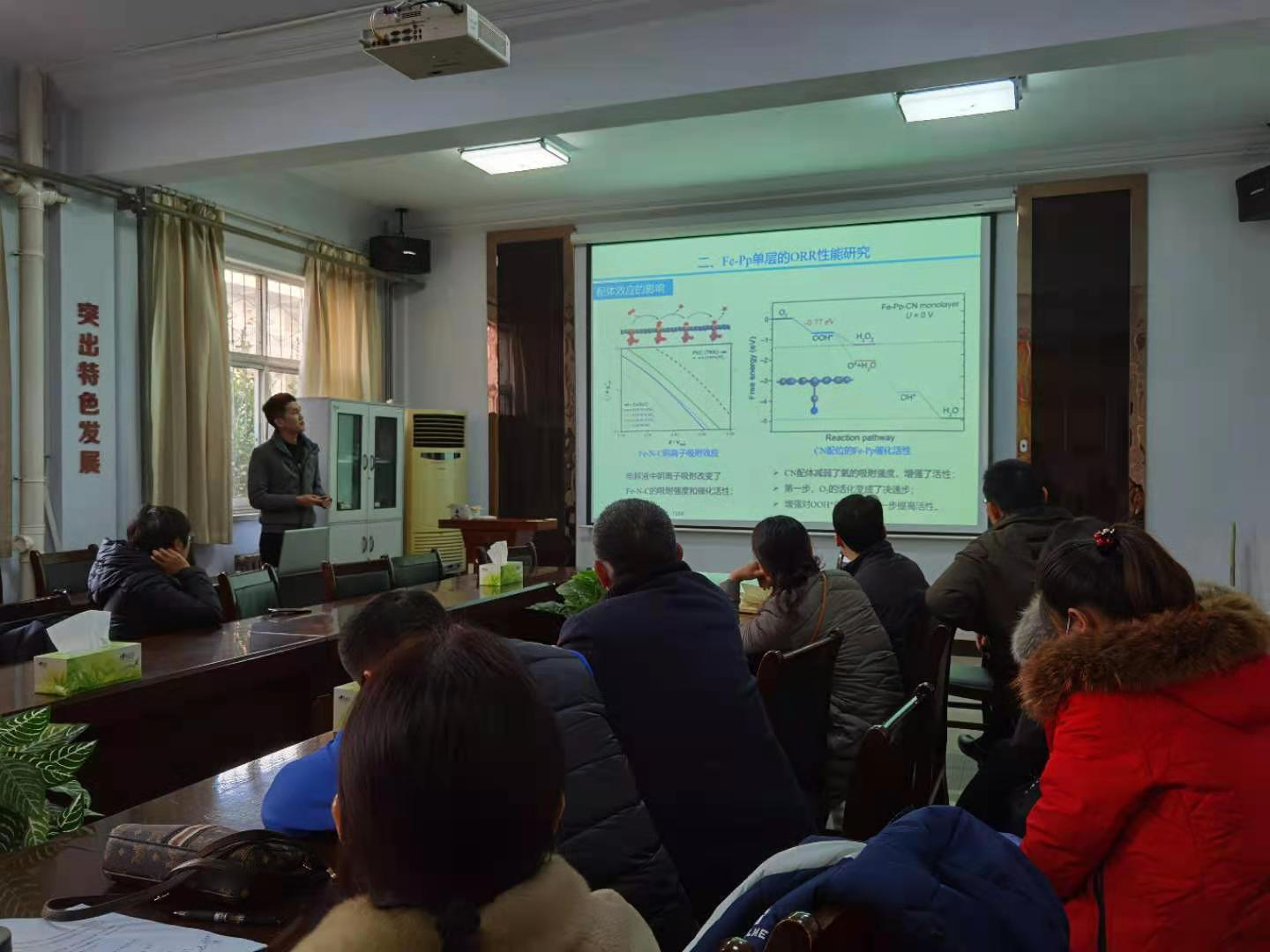 2020年12月4日下午,英国365集团官网进行了本学期第五期博士论坛。青年教师罗干博士在睢阳校区7号楼英国365集团官网一楼会议室做了题为《基于第一性原理的二维单/双原子电催化剂的设计与模拟》的学术报告。本次博士论坛由副经理周艳丽主持,英国365集团官网全体教师参加了论坛。