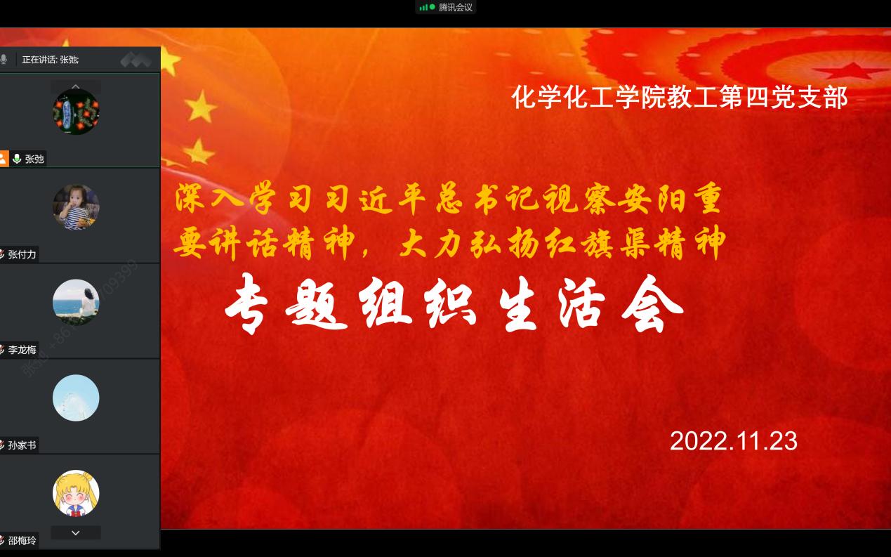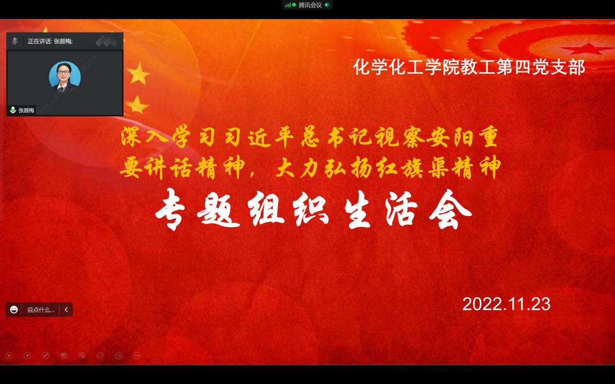 11月23日,英国365集团官网教师第四党支部在线召开“深入学习习近平总书记视察安阳重要讲话精神,大力弘扬红旗渠精神”专题组织生活会,深入学习党的二十大精神,部署支部下一步重点工作。支部书记张弛主持会议,公司党委副书记张颜梅书记出席会议,全体支部党员参加。
