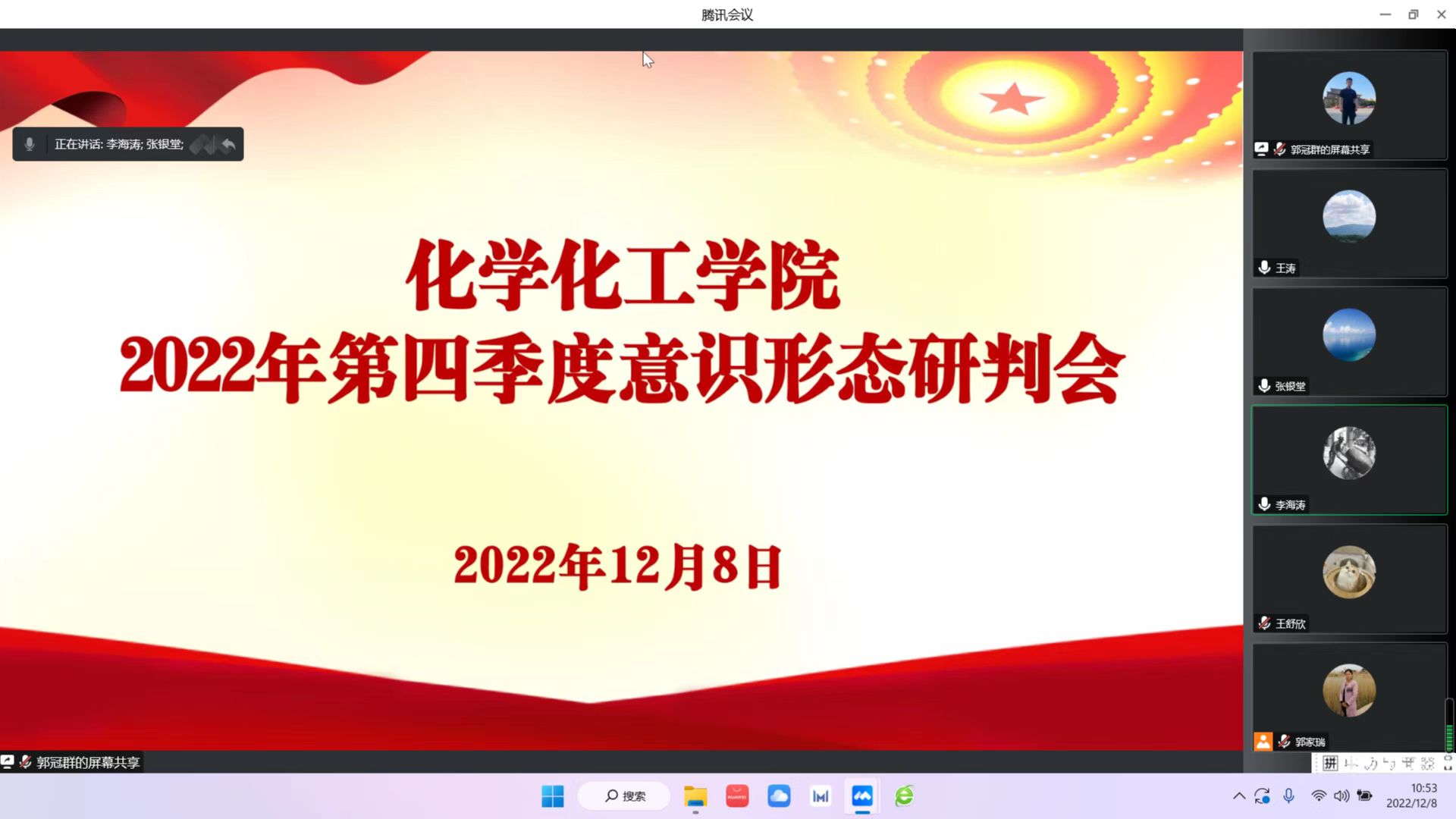 李海涛在听取大家发言后进行了总结,并对明年的意识形态工作提出要求,一是加强理论学习,突出思想引领。深入学习宣传贯彻党的二十大精神,全面加强思想道德建设。二是管好“五个阵地”,彰显党性原则。继续管好课堂、科研、宣传、网络、员工五个阵地,确保不出现任何问题。