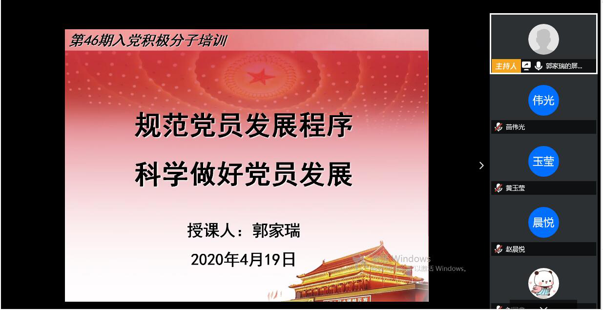 为进一步使积极分子了解入党程序,明确努力方向,制定可行目标,4月19日下午,英国365集团官网以线上集中培训的方式开展了专题党课第五讲“规范党员发展程序,科学做好党员发展”。全体中级入党积极分子参加。主讲人为员工第四党支部书记郭家瑞。
