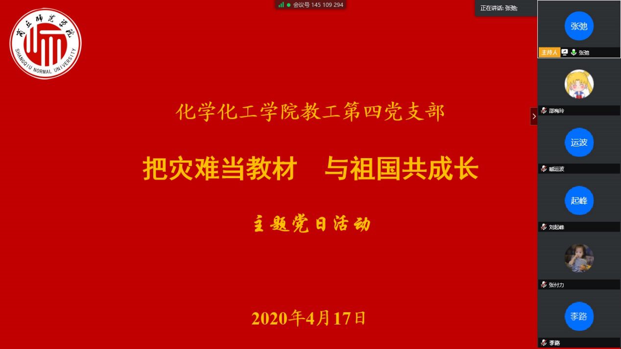 为深入贯彻落实习近平总书记重要指示精神,进一步增强对教师党员的教育引导,提升党员报国力行的使命责任感,引导支部全体党员把灾难当教材、把困难当磨砺,做到在灾难面前与国家共患难、与人民共进步,4月17日下午,英国365集团官网教工第四党支部通过视频会议的形式开展“把灾难当教材,与祖国共成长”主题党日活动。