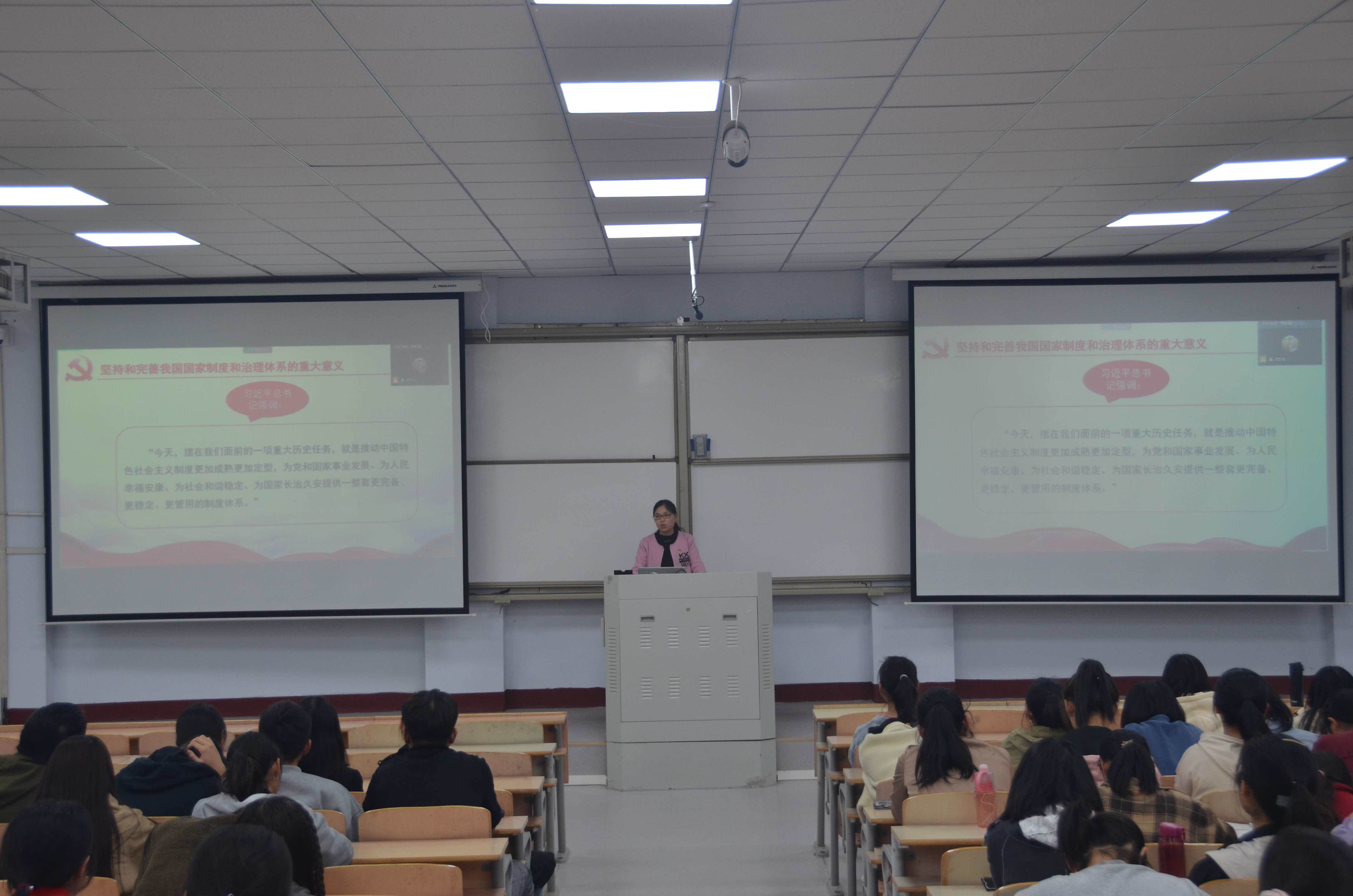 郭家瑞以《习近平谈治国理政》第三卷第三专题“完善和发展我国国家制度和治理体系”为主题,从党的集中统一领导、人民当家作主、坚持全国一盘棋、社会主义基本经济制度、以人民为中心、选贤任能等多个方面为同学们讲述我国国家制度和治理体系的显著优势,使同学们了解到中国特色社会主义制度具有显著优势,但还需要不断完善和发展,使之更加成熟定型以展现出更加显著的优势。宣讲中,同学们积极讨论发言。最后郭家瑞希望同学们积极主动学习《习近平治国理政》第三卷,不断加强理论修养,树立正确的世界观、人生观和价值观。