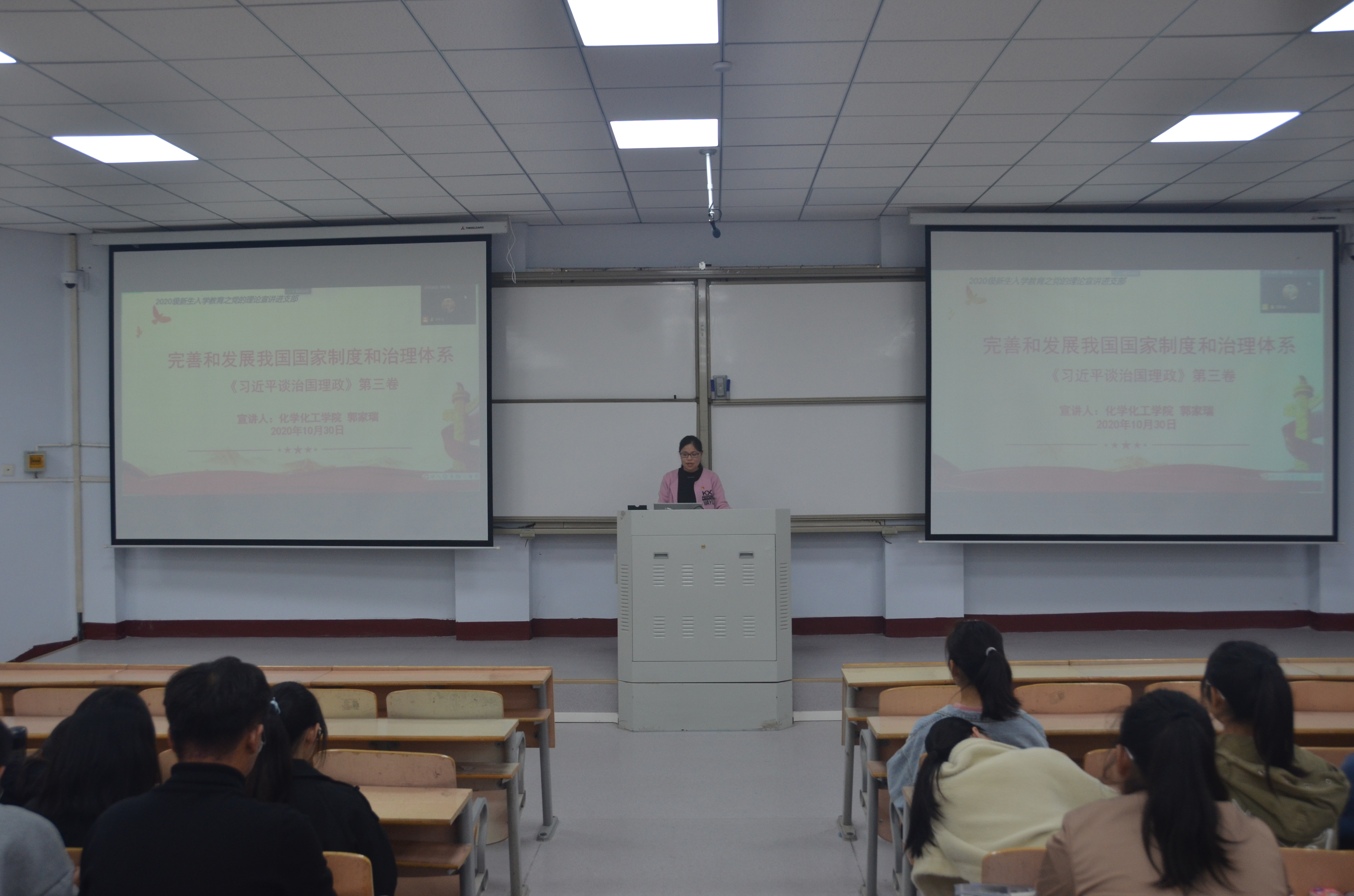 为深入学习《习近平谈治国理政》第三卷,宣传贯彻习近平总书记系列重要讲话精神,2020年10月30日,公司开展2020级新生入学教育之党的理论宣讲进支部活动,公司团总支副书记郭家瑞宣讲,为2020级新生进行了一场党的理论知识培训教育。