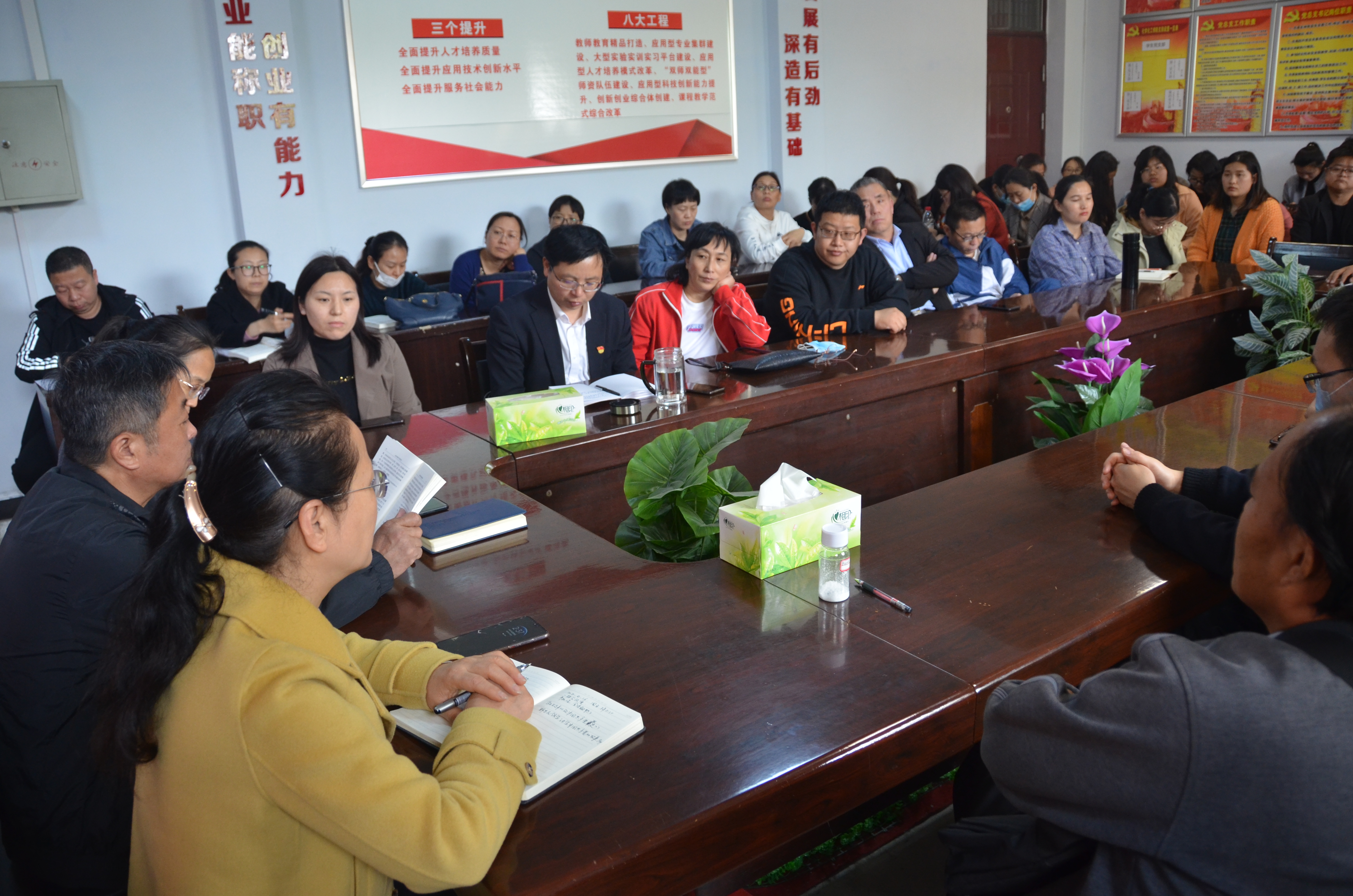 韩忠民指出《习近平论中国共产党历史》一书是习近平总书记关于中国共产党历史的重要论述,内容丰富全面,是我们开展党史学习教育的必读书目。韩忠民领学了书中的部分篇目:《讲好中国共产党的故事》、《总结党的历史经验,牢固树立“四个意识”》、《学好党史、新中国史、改革开放史、社会主义发展史》,向大家讲述了全国道德模范龚全珍同志艰苦奋斗的感人事迹,并希望大家都要像龚全珍同志学习,把艰苦奋斗精神一代代传承下去。韩忠民强调,要把社会主义核心价值观贯穿于高校办学育人全过程,弘扬以爱国主义为核心的民族精神和以改革创新为核心的时代精神,坚持用社会主义核心价值观引领知识教育、引领师德建设。
