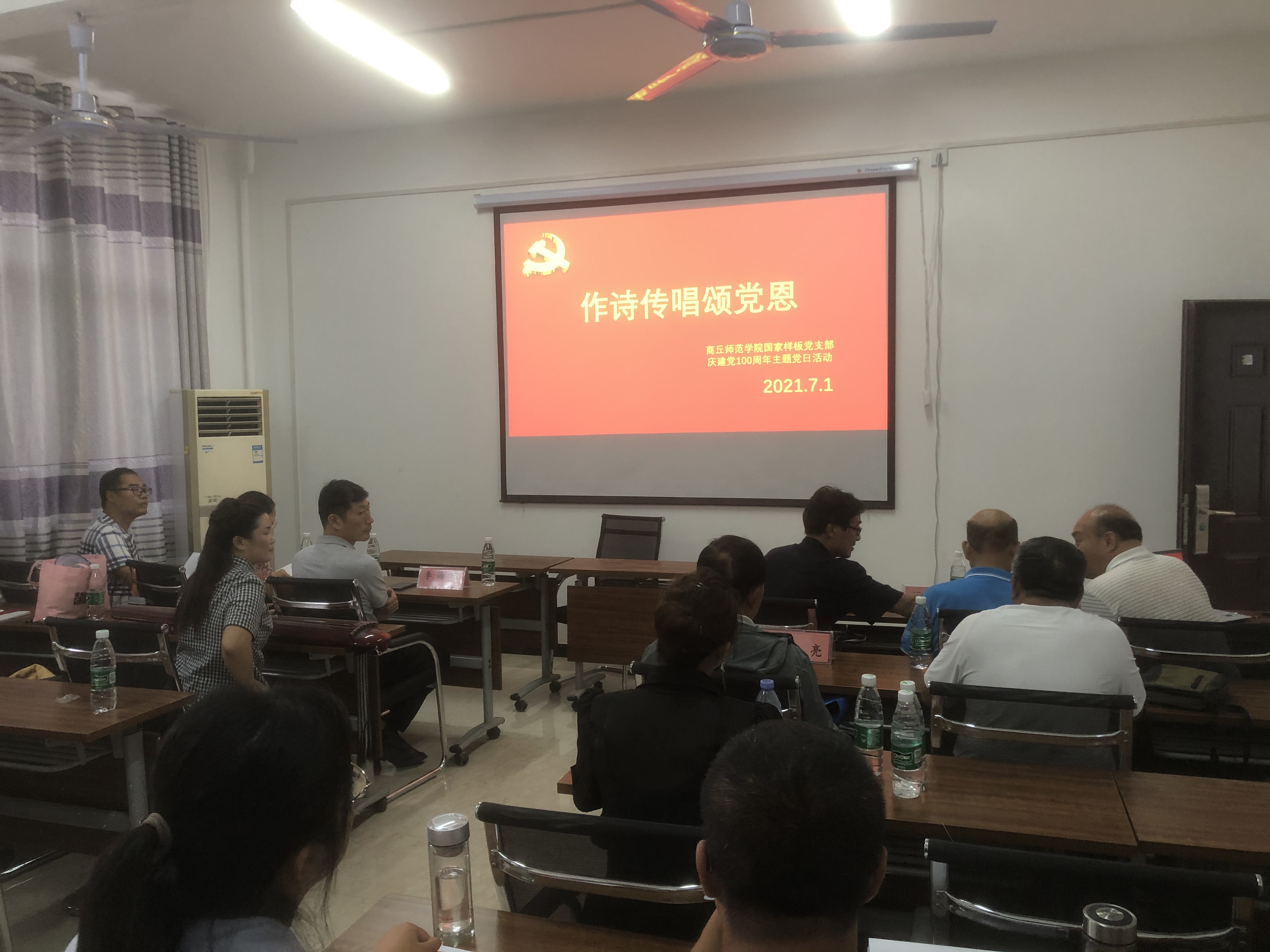 为庆祝中国共产党百年华诞,2021年7月1日,英国365集团官网教工第二党支部邀请中华诗词学会会员、商丘诗词楹联协会副会长李瑞祥一行7人以及公司党委书记李海涛同志,以《作诗传唱颂党恩》为主题,举办了一次主题党日活动。此次活动由党支部书记魏伟组织,支部党员崔金海主持,支部全体党员同志参加了此次活动。