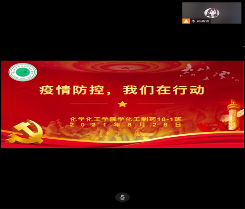 8月26日,化工制药18-1团支部通过腾讯会议组织召开主题团日活动。活动开始,团支部书记赵鑫俐首先传达了校团委《关于开展“‘团’结凝聚,共抗疫情,商师青年在行动”网络特别主题团日活动》文件通知精神,要求支部成员做好假期线上学习、积极参加主题团日活动、主动遵守公司和当地疫情防控要求。之后集体学习了本期青年大学习——惊天动地:创新发展实现强国大业(百年风华专题示范团课四),引领广大青年学党史、强信念、跟党走,确保暑期思想政治引领工作不断线。之后,带领成员学习了防疫科普知识,引导支部成员理性认识疫情,科学做好防护。