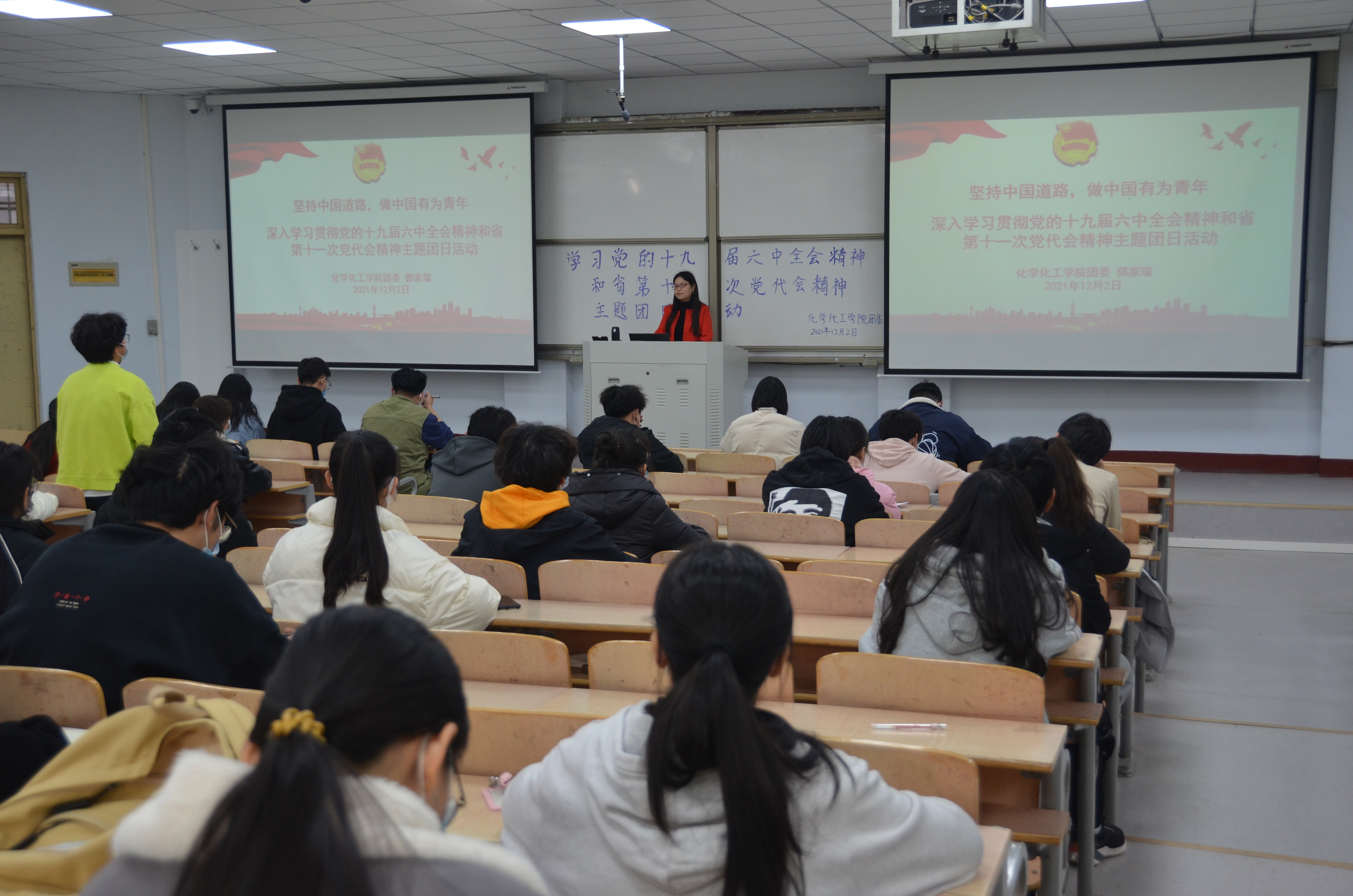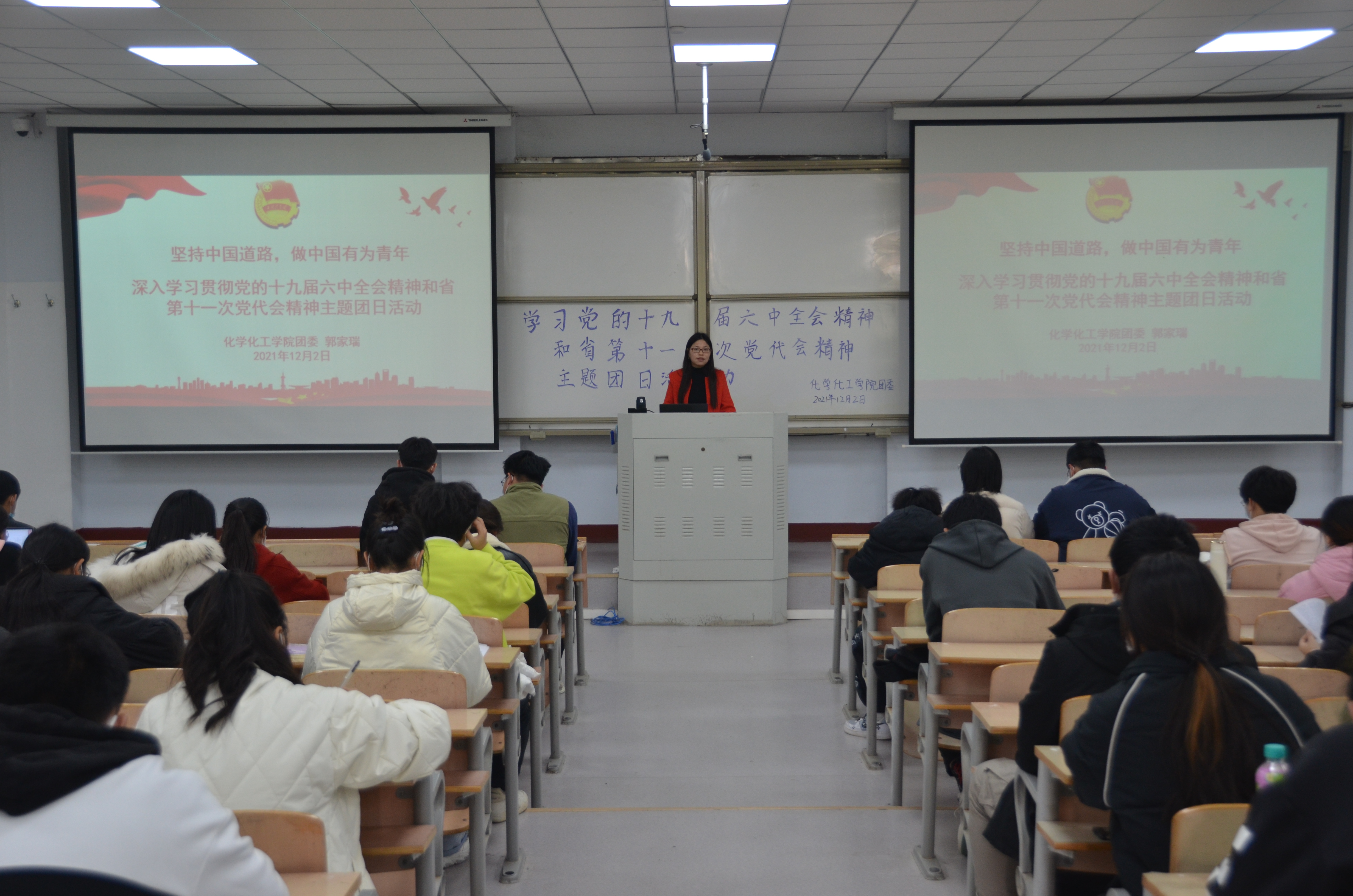 12月2日,英国365集团官网团委于睢阳校区1号教学楼106教室开展“党的十九届六中全会精神宣讲”活动。院团委副书记郭家瑞主持,公司第五期青马培训班全体学员参加。