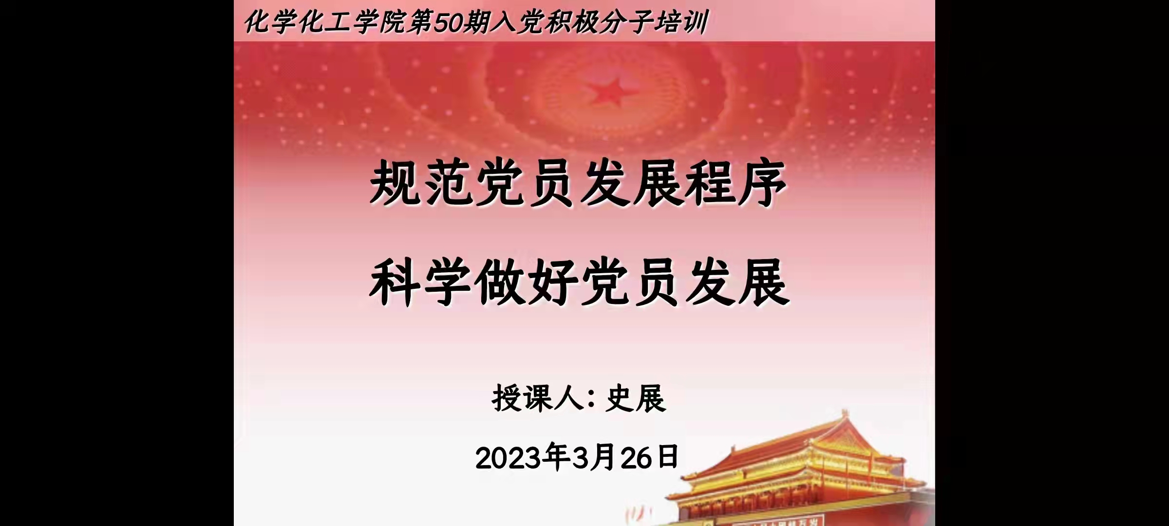为了进一步加强党的建设,增强入党积极分子的责任意识,3月26日,英国365集团官网以线上集中培训的方式开展了“规范党员发展程序,科学做好党员发展”专题党课,学工办副主任史展主讲,全体入党积极分子参加。