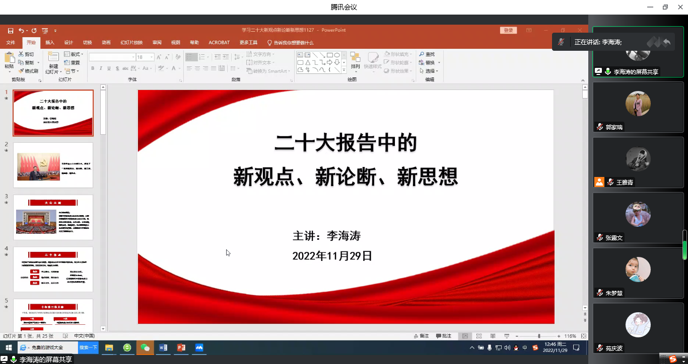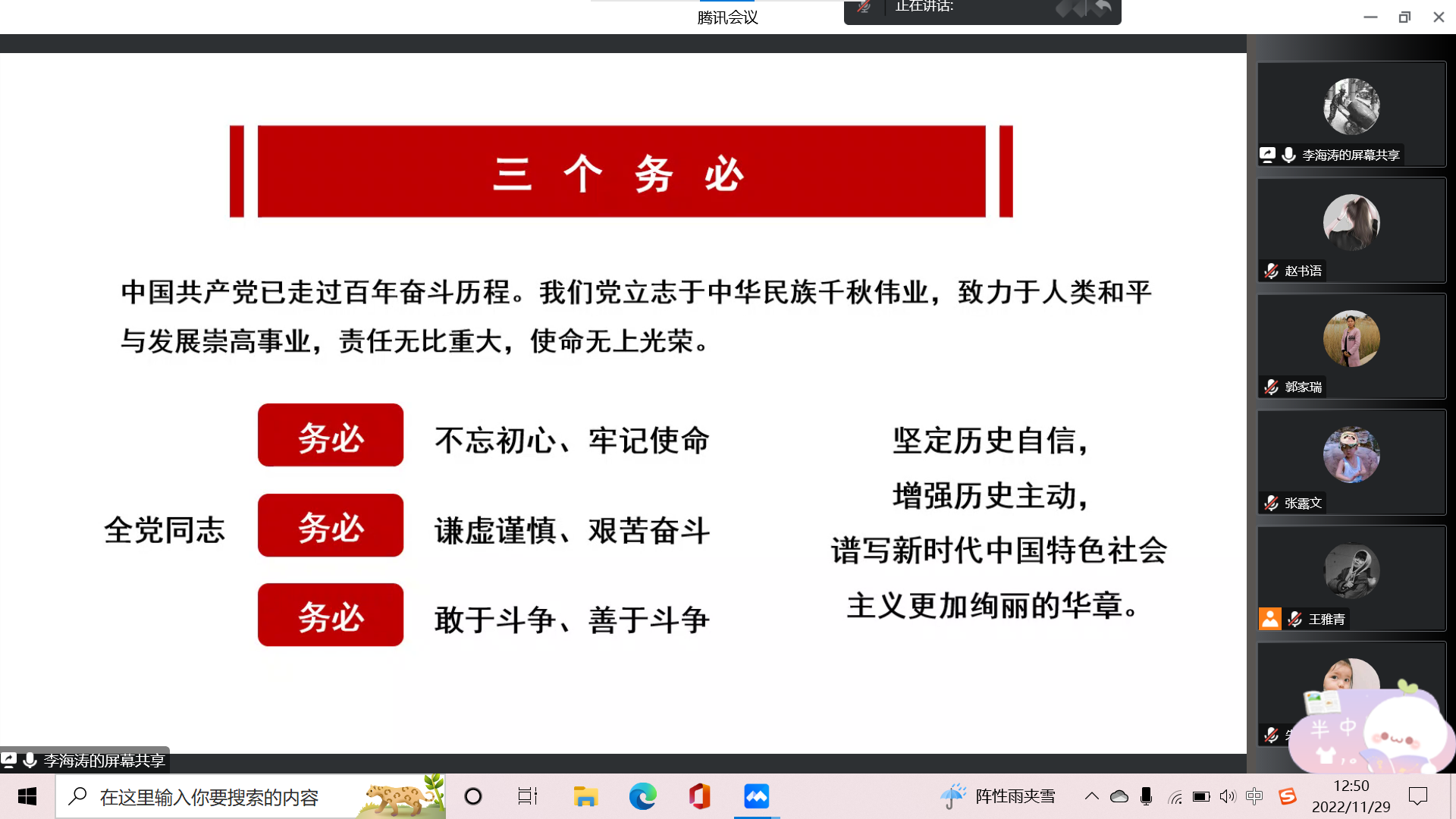为落实分党校预备党员的培训制度,引导员工预备党员深入学习贯彻党的二十大,11月29日中午,公司党委在线组织开展了第一场预备党员培训,公司党委书记李海涛为参训学员上了题为“学习二十大,奋进新征程--二十大报告中的新观点、新论断、新思想”的党课。员工第四党支部书记郭家瑞和员工预备党员参加。