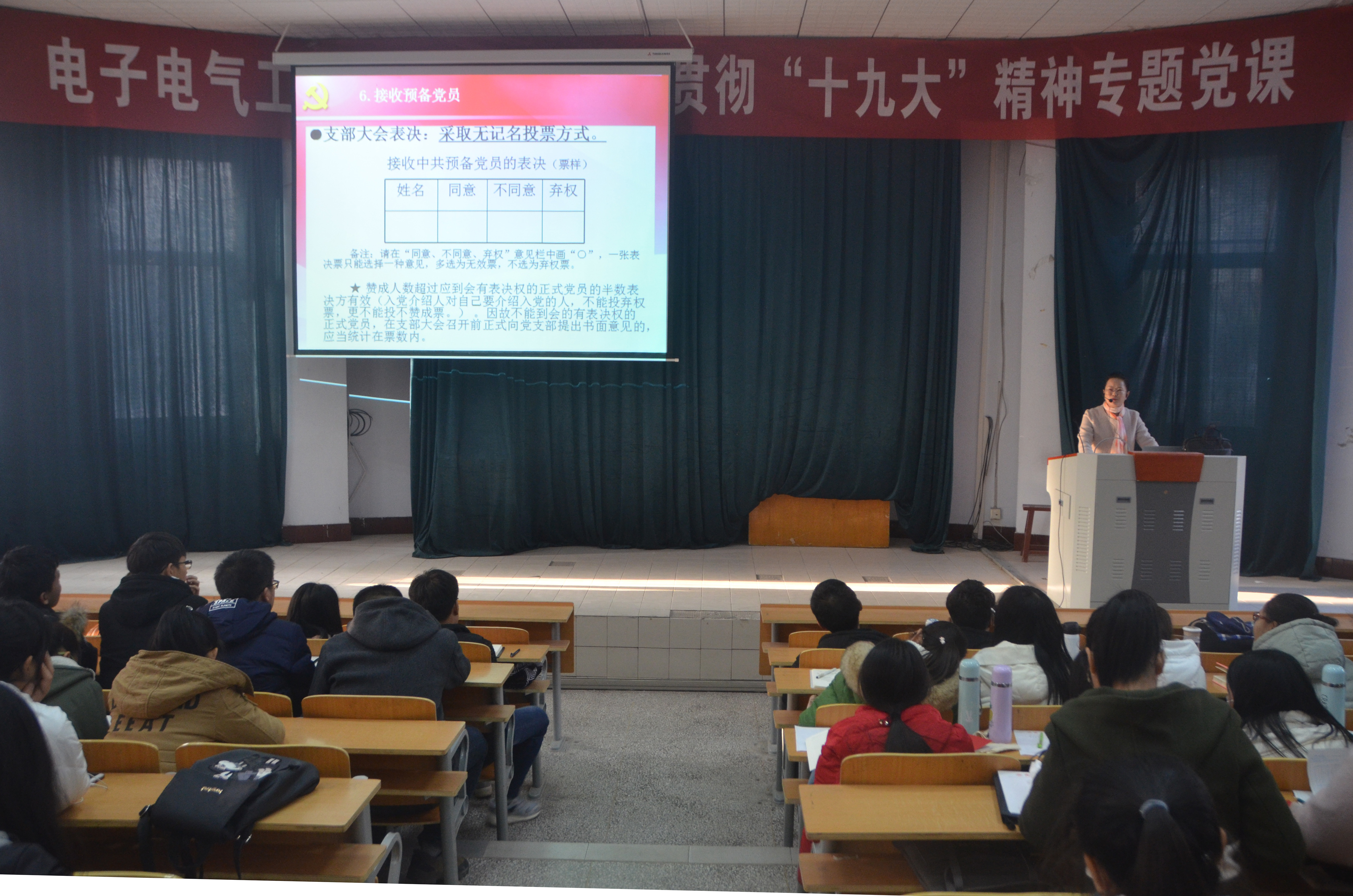 此次讲座主要针对目前员工对入党程序及有关方面的认识存在不足而举办。讲座主要介绍以下三面的内容:一是申请入党的条件和党章对党员的基本要求,特别强调指出申请入党人必须年满十八周岁,自愿申请入党,并指出党员要全心全意为人民服务,不得谋求私利及特权;二是发展党员工作的方针、原则和程序;三是党员发展文本资料书写要规范。