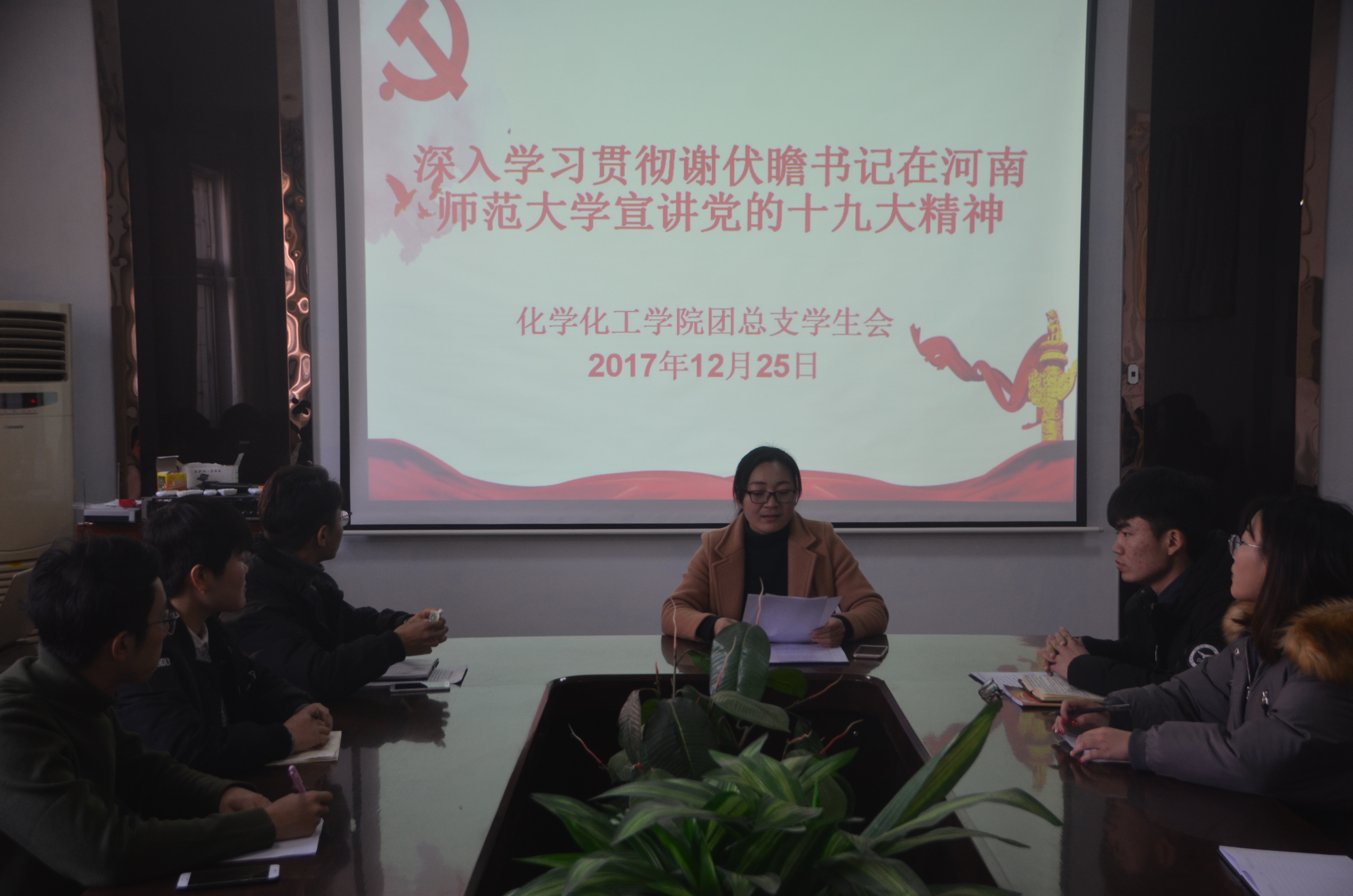 12月25日中午12:40,公司于公司文化路校区7号楼院会议室召开以“贯彻谢伏瞻书记在河南师范大学讲话精神”为主题的学习会。会议由公司团总支书记李龙梅主持,全体团总支员工会成员参与。