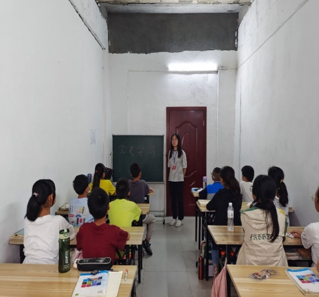 7月25日,宣讲团成员结合当今时事,将党的光辉历史讲给青少年,将党的正确思想传达给青少年,从疫情防控到防汛救灾,都是党领导人民群众团结一致、万众一心的结果。当地居民深受感触,孩子也更加坚定信念,立志一定要好好学习,将来报效祖国。团队成员带领青少年制作党史学习手抄报以便更多地学习党史知识。