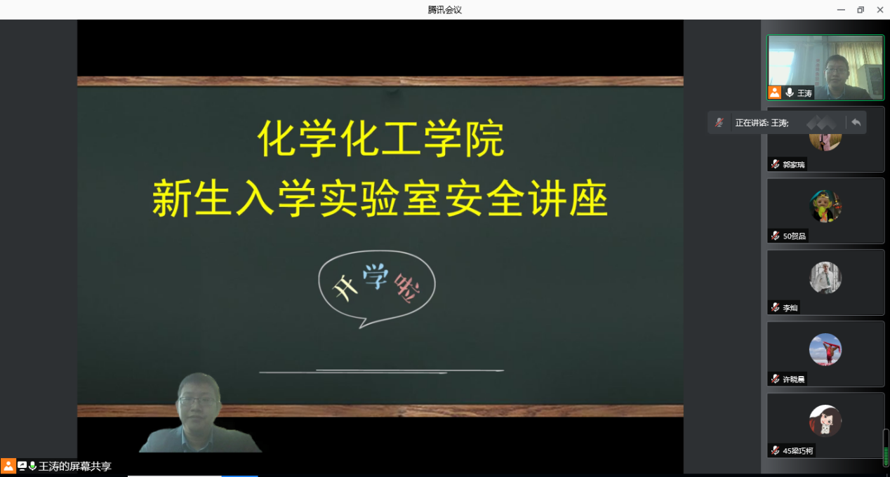 会议伊始,王涛向全体2021级新生介绍了实验室安全的重要性,学习应对安全事故的必要性。随后,朱旭通过实验室安全事故的典型事例向同学们介绍了安全事故发生后的严重后果,分别从实验室用水安全、用电安全、气体安全、用火安全、易燃易爆试剂安全等方面介绍了预防事故发生的方法,并提醒同学们通过不断学习实验室安全基础知识、掌握合适的方法将事故扼杀在摇篮中,做到防患于未然。