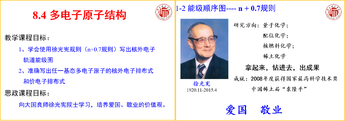 本节课有机融入课程思政元素,课前让同学们自行查阅徐光宪院士的资料,课中和同学们交流讨论,倡导同学们学习徐光宪先生爱国、敬业的精神,课后推荐员工阅读《一清如水—徐光宪传》这本书,进一步了解徐先生的伟大成就和爱国情怀。