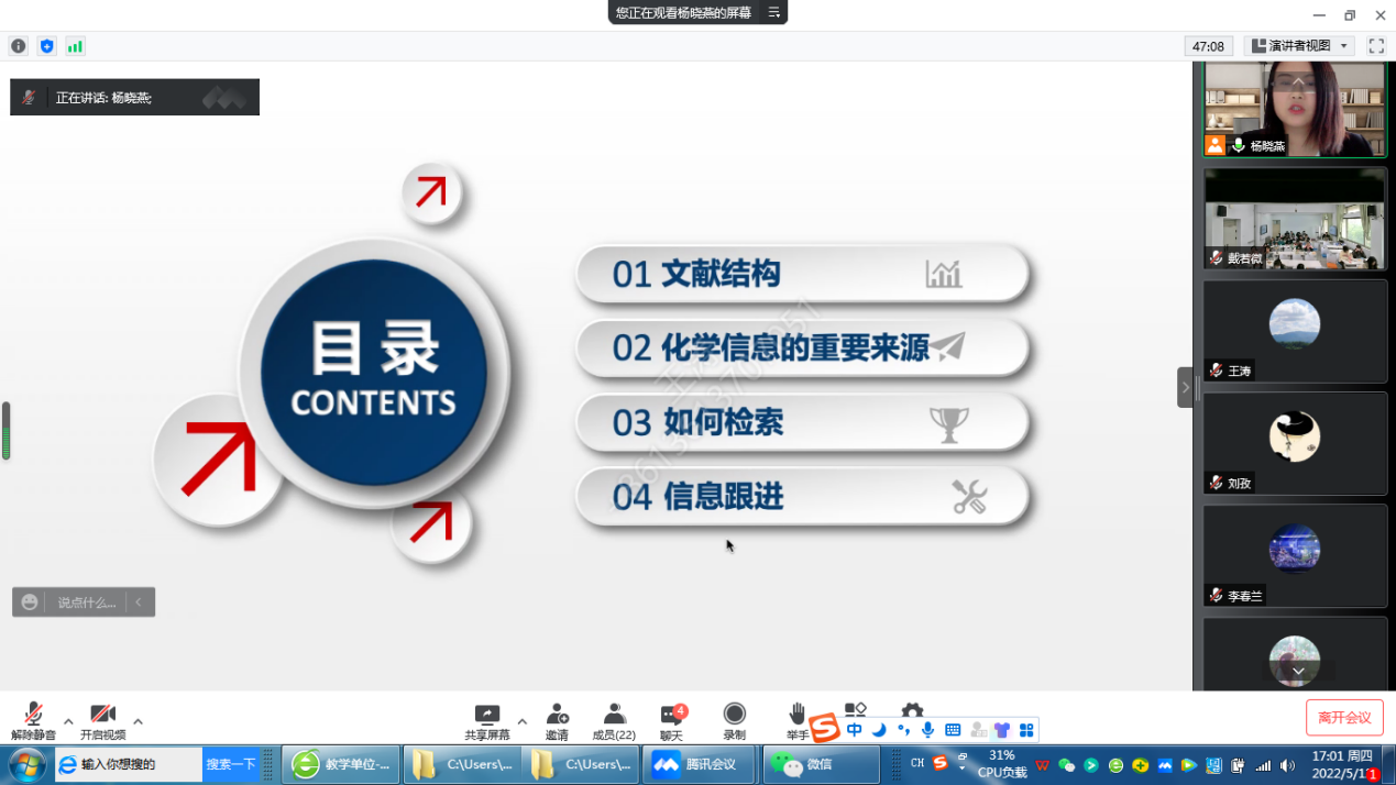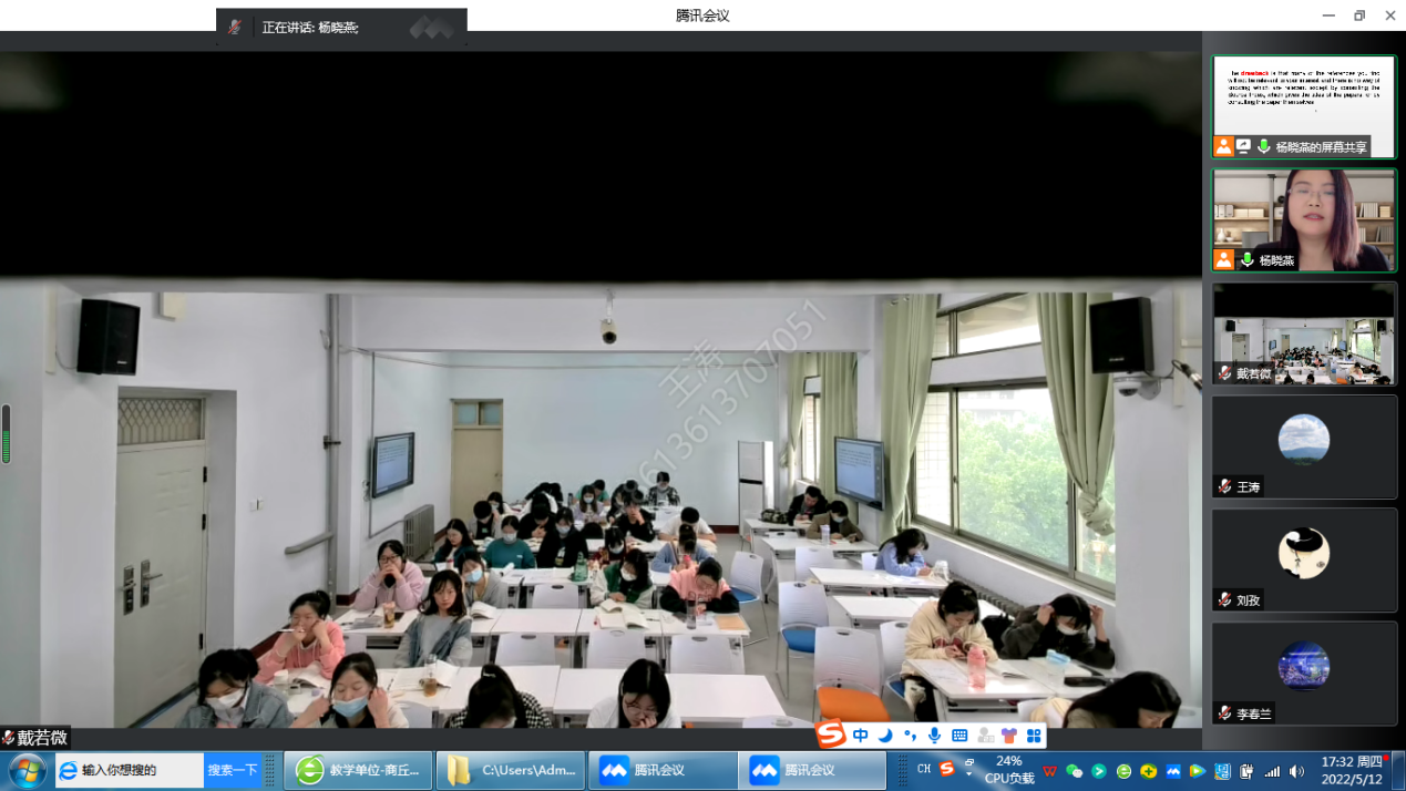 2022年5月12日下午第7节,英国365集团官网杨晓燕老师《专业外语》公开课通过腾讯会议进行。英国365集团官网副经理王涛以及近两年新进无课老师在线进行了观摩。