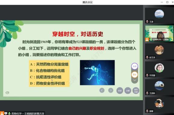 11月24日下午第6节,英国365集团官网王晓娟老师的《药物化学》课程教学范式改革公开课通过腾讯会议如期进行。副经理王涛,校督导团成员张付力,院督导团成员韦秀华以及制药工程专业部分老师进行了线上课堂观摩。