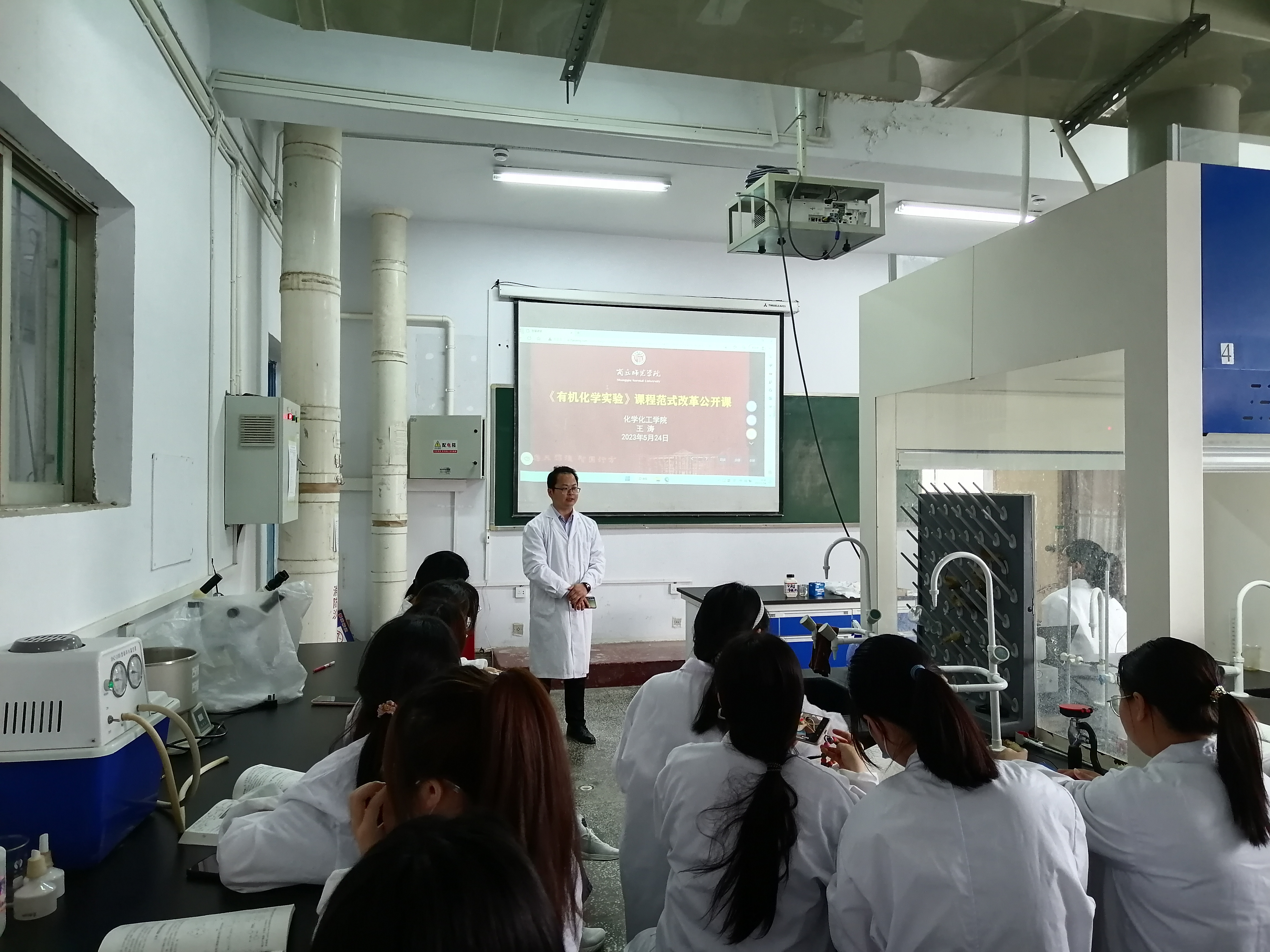5月24日周三下午第5节课,英国365集团官网王涛老师负责的《有机化学实验》课程教学范式改革公开课在睢阳校区化学实验楼407实验室举行,制药工程系副主任张明亮、公司督导团成员臧运波以及近三年新入职青年教师观摩了此次公开课。