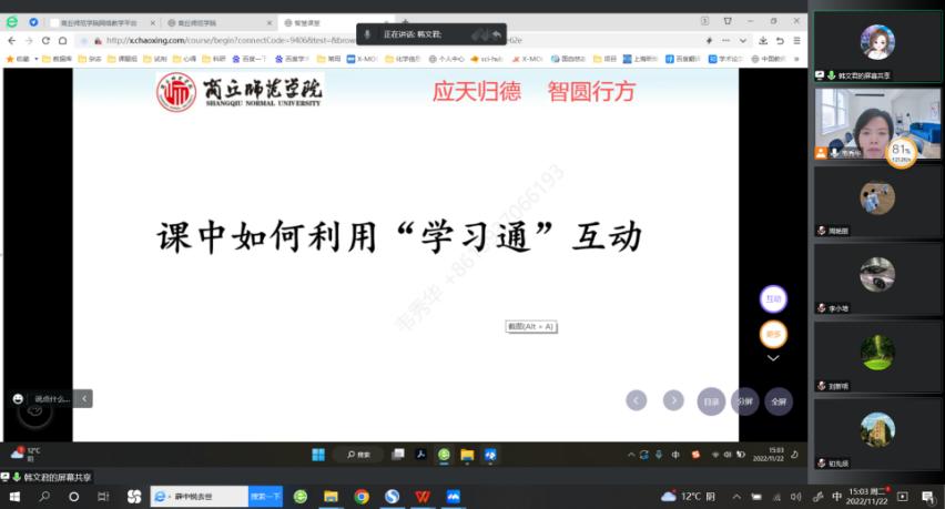 研讨会上各位老师首先交流了近阶段课堂上员工的学习状况,其中如何激发员工线上课堂的学习兴趣,打造以学习者为中心的教育生态是当前每位老师需要思考的问题。针对这一共性问题,韩文君老师分享了自己的做法。她从如何选用线上教学平台,如何利用学习通进行签到、投屏,课堂上如何与员工通过选人、投票、抢答、主题讨论等功能互动,课堂表现如何量化管理四个方面进行了介绍。
