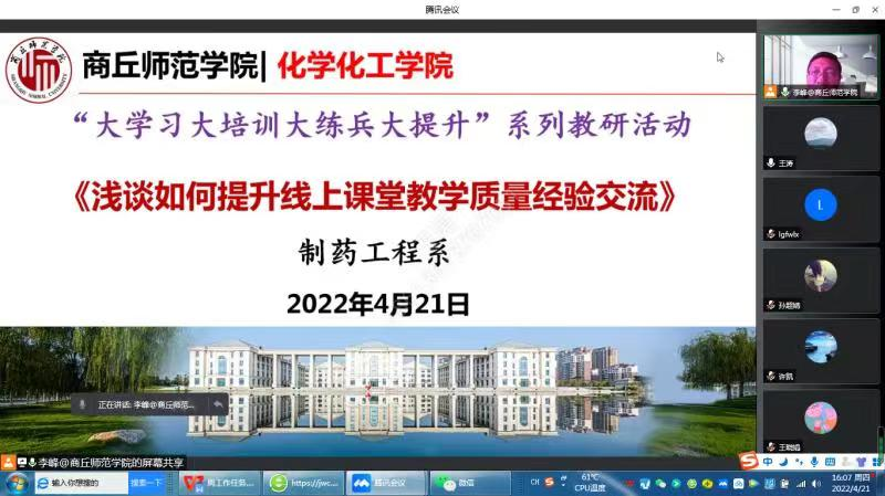 为了进一步规范线上教学工作,加强线上教学过程中的师生交流互动,调动员工的学习兴趣和学习热情,切实提升线上课堂教学质量,结合学科专业特点,4月21日,制药工程系采用腾讯会议召开了浅谈如何提升线上课堂教学质量经验交流会,本次活动由制药工程系主任李峰老师主持。